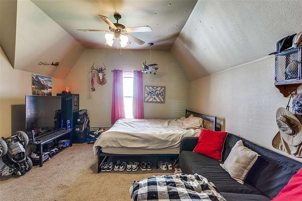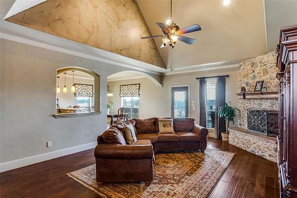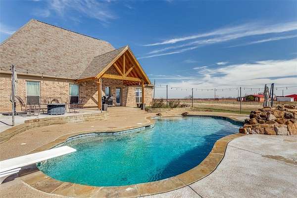 4.94 Acres in Paradise Texas with Pool! 4 beds, 2.5 baths, 2 living and Unfinished Bonus room(s) with HVAC. This sprawling cobblestone Tudor estate has a porte cochere with copper gutters, corbel accents and inlaid stone accents. The custom door welomes you into the grand living room with real wood floors, heavy textured archways and a vaulted beamed ceiling with raised hearth wood burning fireplace. The entertainer's kitchen has a pass through bar, glazed cabinets, walk-in pantry, built-in microwave, electric range w vent hood and tumble marble backsplash. The eat-in kitchen has a large breakfast room with wood-inlaid floors and bar stool seating looking onto the expansive patio. The primary ensuite boasts a tray ceiling, jacuzzi tub, large walk-in shower, dual-sink vanity, and walk-in closet. The split layout affords privacy with two additional beds down - each with direct access to the full bath with shower tub combo. This flex plan has a spacious second living down that could also serve as an in-law suite, playroom, media or grand office suite. Upstairs find an additional bed with half bath and an unfinished bonus suite with hvac. See drawing in transaction desk. Outside enjoy a 15x10 covered patio with vaulted pergola, an open patio, chlorine diving pool with waterfall, sun ledge and firepit.