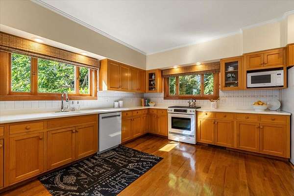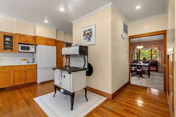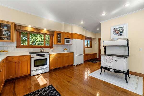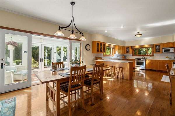 This traditional Craftsman home sits on 1.5 acres and is framed by a complementary collection of mature trees. It was built with the skill and quality of materials that are rarely seen today, but expected in the homes of bygone years that inspired this beauty. Inside and out, you'll be impressed by the attention to detail, materials, and construction. Old-growth redwood siding, red oak floors, solid and dovetailed custom-built red oak cabinetry and banisters, custom-crafted Old-growth Douglas Fir fireplace mantle...the list goes on. The sunroom leads to the private greenbelt backyard featuring a brick patio and fire pit with historical beginnings right here in Ferndale. The fenced pastures, barn, shop, and dog kennel building make this property a perfect oasis for country living in town.