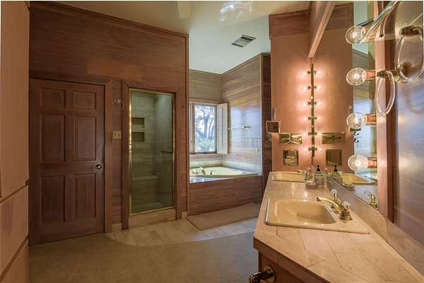- Bookcases, Built-In Features, Ceiling Fan(s), Ceiling-High, Ceiling-Vaulted, Chandelier, Crown Molding, Double Vanity, Interior Steps, Kitchen Island, Multiple Dining Areas, Multiple Living Areas, Natural Woodwork, Primary Bedroom On Main, Recessed Lighting, Sauna, Soaking Tub, Tile Counters, Two Primary Closets, Walk-In Closet(s)