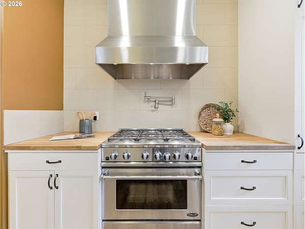 - Builtin Oven, Dishwasher, Disposal, Double Oven, Free Standing Gas Range, Free Standing Refrigerator, Island, Plumbed For Ice Maker, Pot Filler, Range Hood, Stainless Steel Appliance