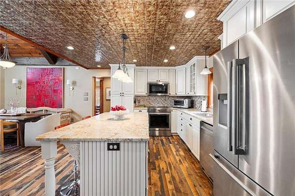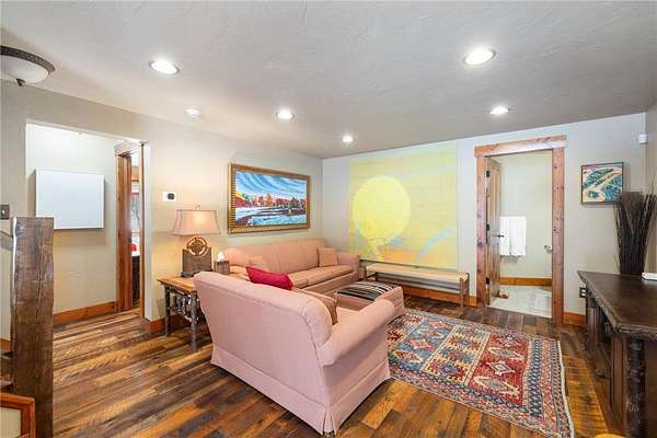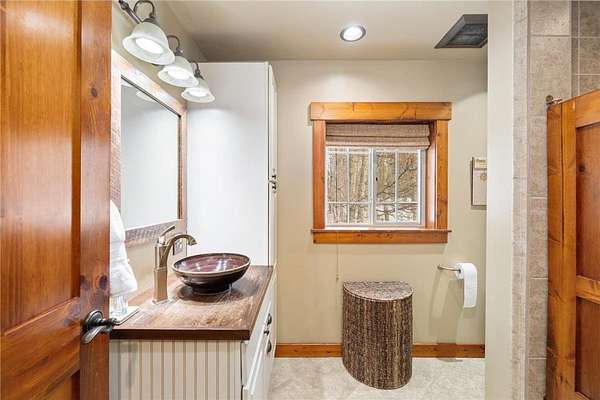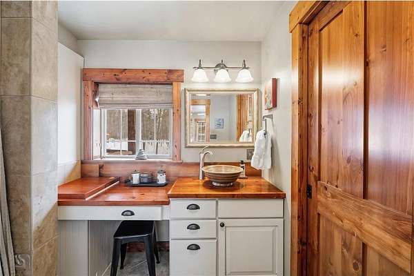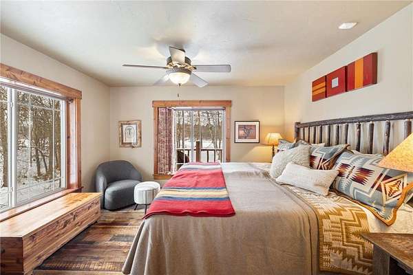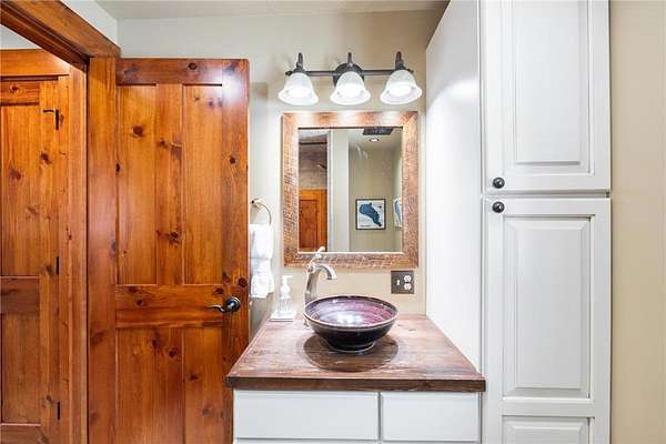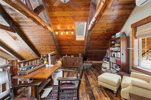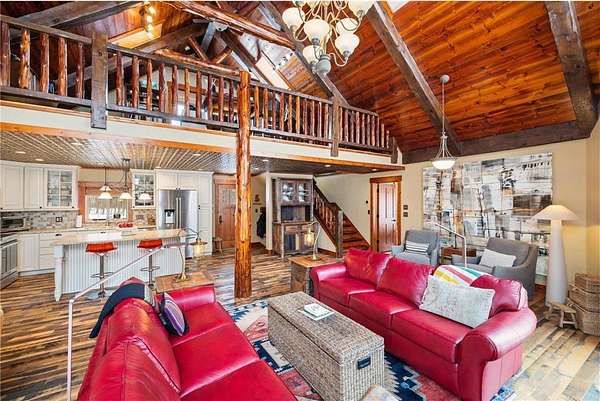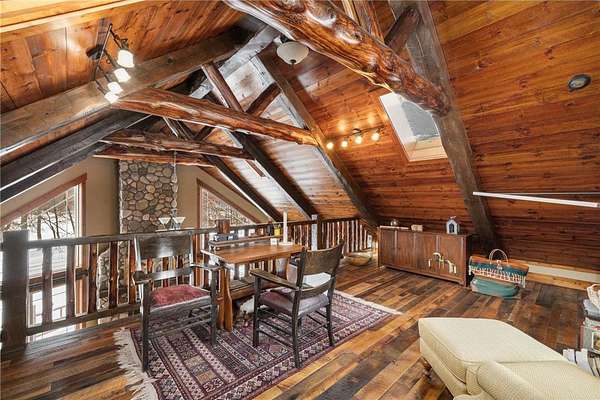 Featuring 3 bedrooms, 3 bathrooms, plus an office and loft, this home boasts a thoughtfully designed floor plan and a warm, inviting feel throughout. Custom reclaimed oak flooring flows through the main living spaces, while a stunning 22-foot stone fireplace anchors the great room, framed by lakeside windows with breathtaking views.