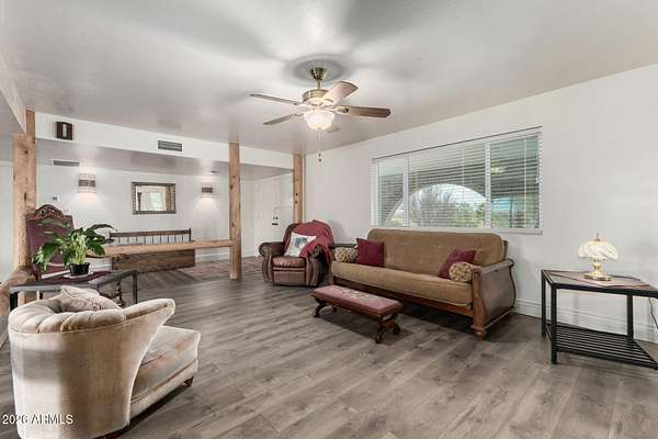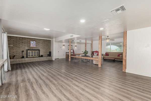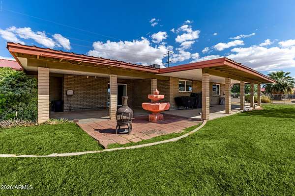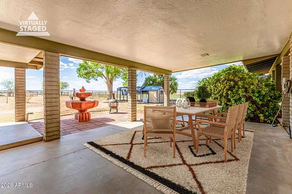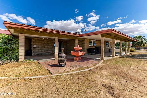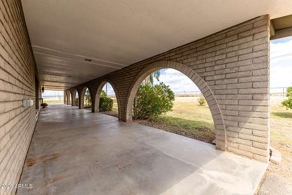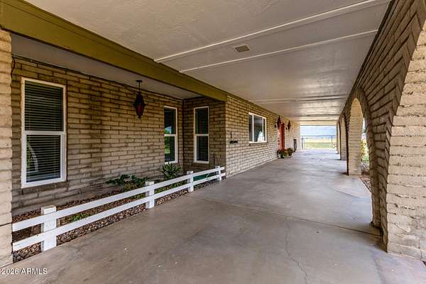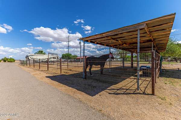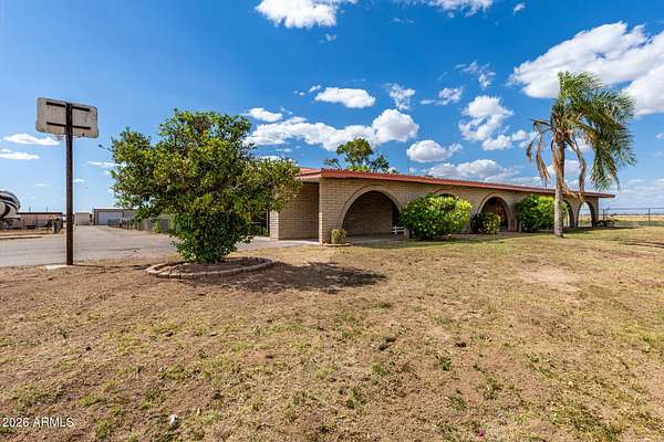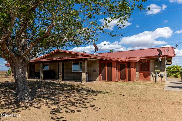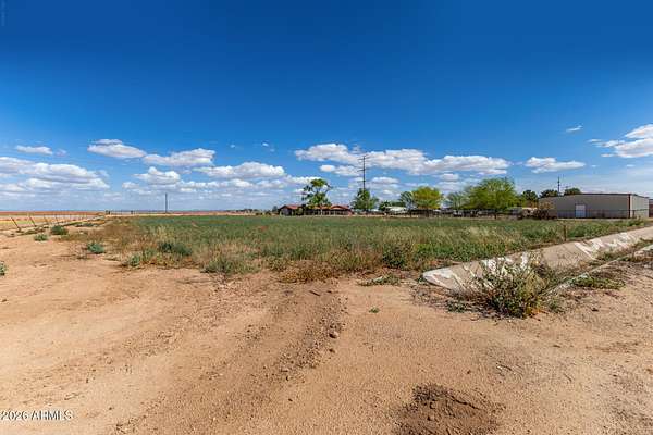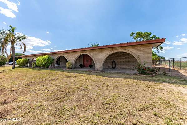 RARE PINAL COUNTY LEGACY ESTATE. 8 ACRES W/ IRRIGATION RIGHTS. This property consists of two 4-acre parcels boasting water rights--a feature nearly extinct for properties of this size. Includes approx 5 acres of established, income-producing alfalfa. The residence is a 2,500 sqft custom brick ranch defined by western elegance & modern upgrades. Features include a full-length front patio and double-door entry. The light & bright interior offers peeled pole accents, vinyl flooring & 4 in baseboards, updated kitchen, with granite countertops, SS appliances & pullout shelving. The oversized primary suite features private patio access & luxury en-suite with massive walk-in tile shower. Huge Utility Room off kitchen with ample storage, sink & door to yard. Outside you will discover an industrial 2300 soft steel shop w/2 auto-doors, water, electric & built air compressor. For the equestrian you will find covered stall w/turnouts, round pen, arena, hay shelter, & refurbished sea can to rack room. Behind the shop are livestock pens complete with chute, small pens, cover, water and electric. The front yard includes a multitude of fruit trees to include, orange, grapes, apples, plums, grapefruit and pomegranate. There is plenty of space for a vegetable garden. The possibilities are endless!