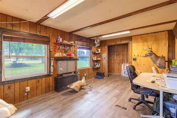 4 Bedroom home on over 75 acres with multiple shops for sale in Western Oklahoma. Rare find in this spacious home with tons of extras making country living a reality. 2 living areas, 4 bedrooms, 3 bathrooms and an enclosed sunroom with endless possibilities. Kitchen has many cabinets and an abundant amount of counter space for entertaining. Cozy up in front of the wood burning stove and watch wildlife frolic all around. The primary bedroom has a large walk in closet and access to the enclosed sunroom. The backyard oasis is fenced and has a large covered porch for watching the Oklahoma sunsets. Enjoy privacy by being on a dead-end street surrounded by wooded lands. The Main shop is 60'x70' partial spray foam insulated, 220 wired, water, 4 Overhead Doors: 10' and 14', LED Lighting, And A Half Bath--Perfect for A Man Cave, Business Use, Or Storage. Electric was recently updated in this shop. There is another large shop/barn, 9 lean to sheds with water access, large shop that was used for indoor/outdoor dog kennels, making this the perfect property for a hobby farmer, goats, horses or cattle. A metal roof helps with insurance costs and newer tinted windows will lower utility bills. Well water with new pump in 2024 and city water included! There is a basement for storm season, and the list of "extras" goes on and on with AMAZING property. Must see to truly appreciate!