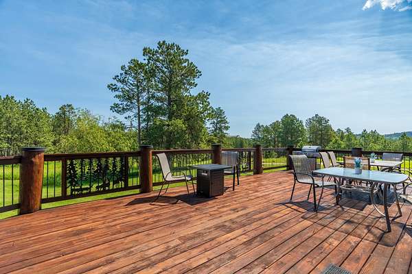 BLACK HILLS HIDDEN GEM! Custom build 4 bedroom/3.5 bath home currently used as a vacation rental, perfectly set on a wonderful spacious lot with no covenants and two RV sites to boot! Exquisite home that's mesmerizing from top to bottom, on almost 4 pine-dotted acres! Chef's delight kitchen with plenty of black granite countertops, center island with cooktop, stainless steel appliances, impressive tile backsplash, and striking Acacia Asian walnut hardwood floors extending into the dining room and jaw-dropping great room showcasing a sky high vaulted ceiling, custom log pillars & elk antler railings lining the magnificent staircase, plus a cozy rose quartz fireplace. Ornate French wood doors lead you to an expansive open deck covering 809 sq. ft. & overlooking a spacious fenced backyard. Main floor master suite with full bath highlighting an Italian Travertine tile walk-in shower, jetted tub & heated tile floor. Guest bed featuring more Acacia Asian walnut wood flooring, 1/2 bath & convenient tucked-away main floor laundry. Grandiose loft en suite has its own deck & full bath hosting a tile walk-in shower & heated tile floor. Sprawling basement family room highlighting a custom wet bar with solid slab of ponderosa pine. Root cellar is accessible from the basement laundry room. All Pella windows & doors throughout. Oversized 3-stall garage houses oodles of storage. Garden shed, fenced chicken coop & 2 RV hook-up sites. Come home, put your feet up, and never want to leave!