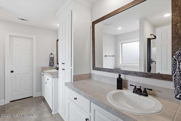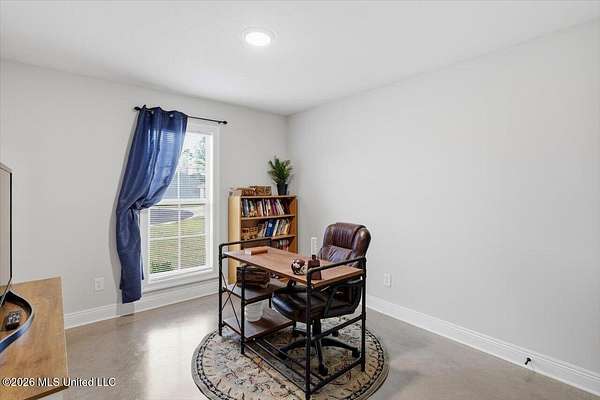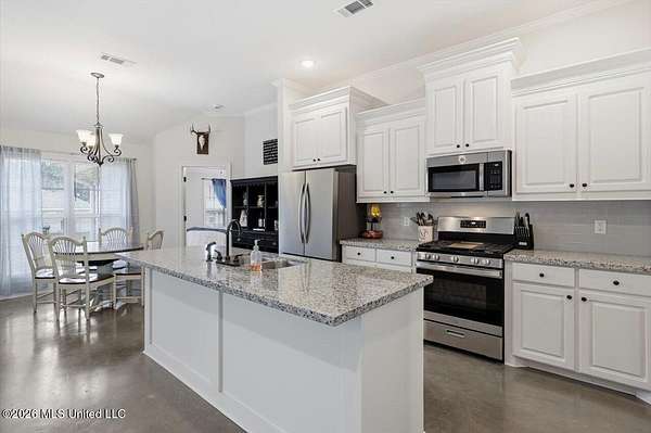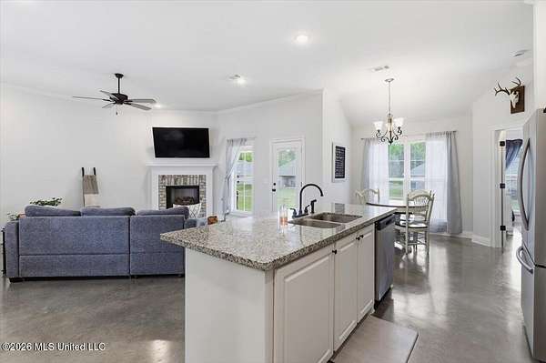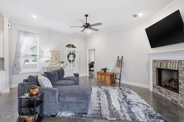 Look here first, sellers are offering $5,000 in buyer concessions. Cute as a button and easy to love! Tucked at the end of a quiet cul-de-sac, this home sits on an oversized, pie-shaped lot with a long, flat driveway--giving you a little extra space where it counts. Gutters already installed and roof is architectural shingles, lasting twice as long as other roofs. Inside, the open layout feels bright and welcoming with great natural light and concrete floors throughout--no carpet, making it a great option for low maintenance living and allergies. The living area features a gas fireplace with a brick surround and clean white mantel for a simple, cozy touch. The kitchen offers a functional setup with an island with seating, gas range, large pantry, and a built-in buffet that works perfectly as a coffee bar or extra storage, plus a dining space overlooking the backyard. The laundry room is conveniently located just off the kitchen. The primary suite includes double vanities, custom framed mirrors, a soaking tub, separate shower, and a storage cabinet between the sinks. Plus, the tankless water heater means hot water won't run out when you need it most. The closet is located in the bathroom, allowing for more usable wall space in the bedroom. On the other side of the home, two additional bedrooms share a hall bath. Out back, you'll find a covered porch overlooking the backyard--great for relaxing after a long day. One of the best parts? The neighborhood has a friendly, connected feel, with holiday events and a semi-annual yard sales.