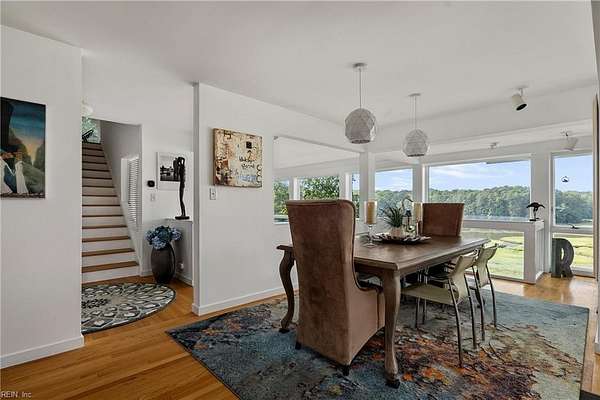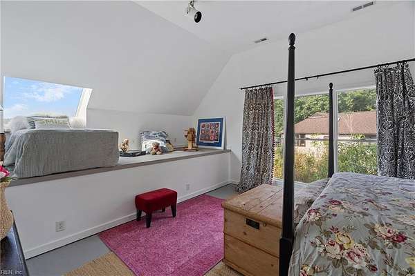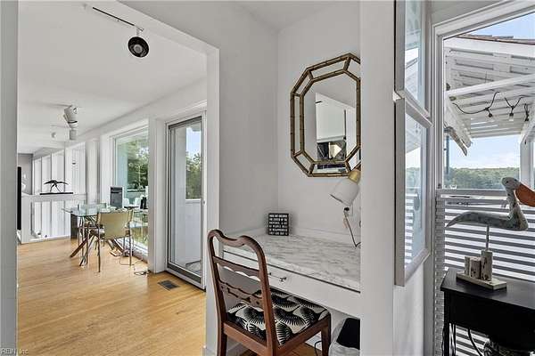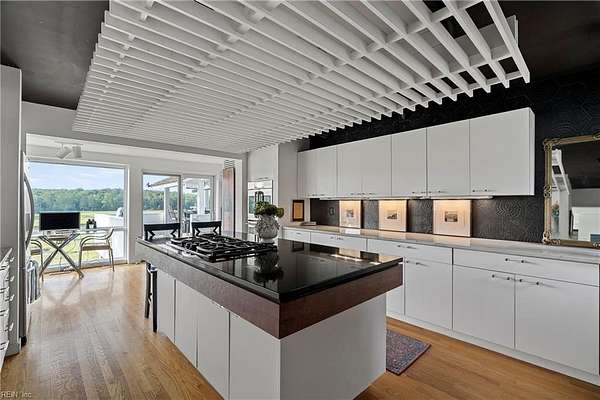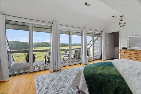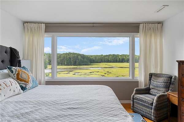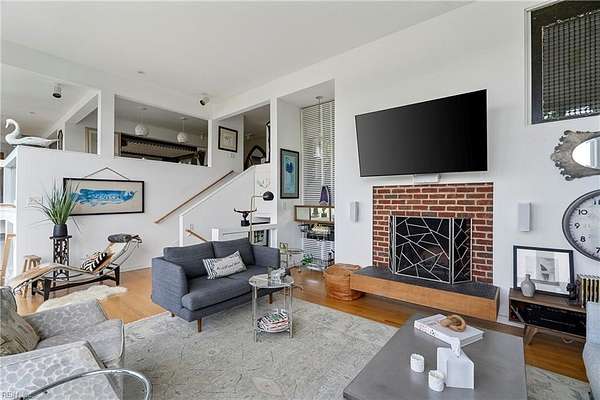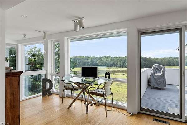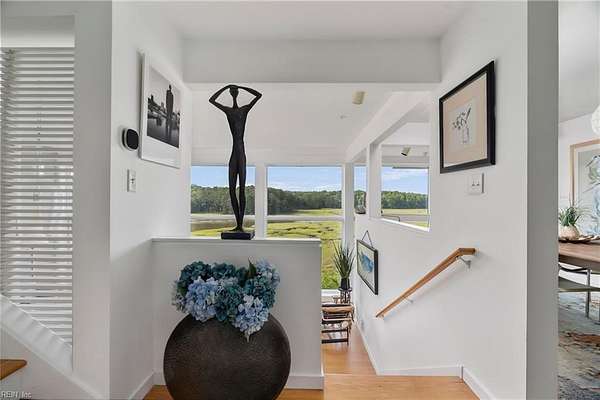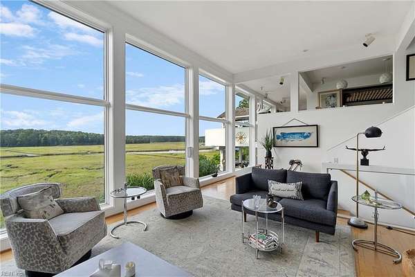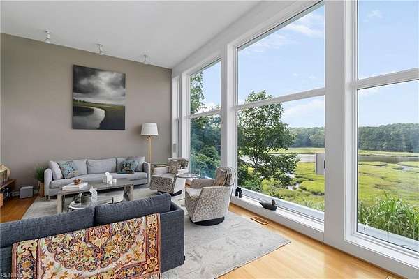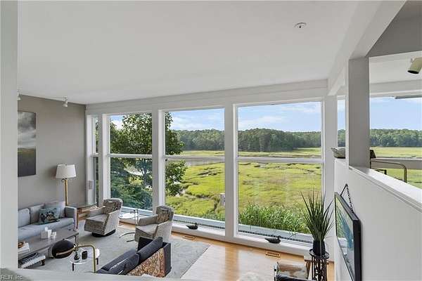 Architecturally stunning contemporary by Carlton Abbott in desirable Queens Lake. Perched atop a 60-ft slope on 3.83 acres, this 4,100+ sq ft home offers sweeping Queens Creek views from nearly every room. Abbott's signature design highlights dramatic rooflines, hardwood floors, natural wood finishes, expansive windows, and peaceful outdoor living. A striking foyer opens to a floor-to-ceiling glass living room. The top-floor primary suite boasts a private balcony, full bath, dressing area, and multiple closets. Three additional bedrooms, 3 full baths, and 2 half baths span 5 unique levels. Great for entertaining, the lower-level screened porch with fireplace and multiple outdoor spaces provide year-round enjoyment. Additional features include a whole-house generator, newer 3-zone HVAC, and updated gutters. Optional Queens Lake membership offers marina, pool, and tennis. Minutes to Colonial Parkway, I-64, Jamestown, Yorktown & W&M-where privacy and convenience meet.