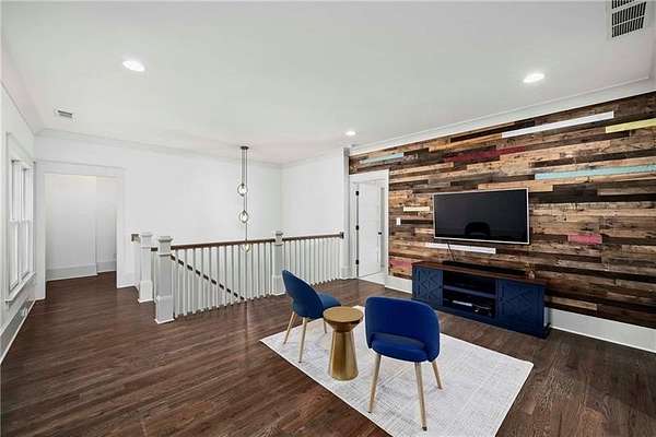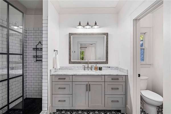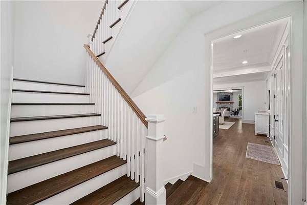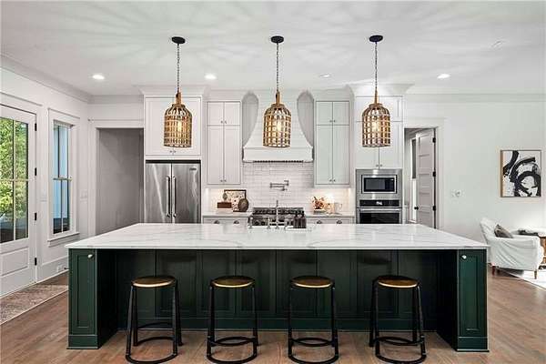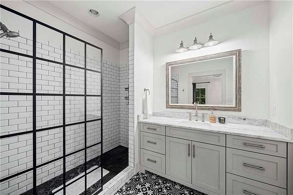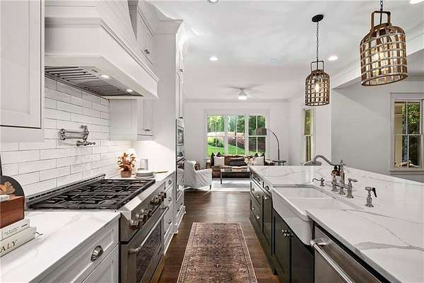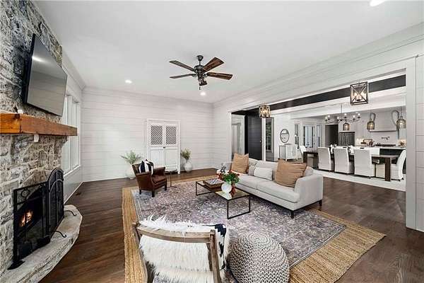 Tucked away on a private cul-de-sac in Long Shadows, one of Alpharetta's most picturesque equestrian enclaves, this modern farmhouse blends timeless architecture with modern comfort on 1.85 acres. A covered front porch with a metal roof and board-and-batten siding welcomes guests inside, where double doors open to an airy floor plan filled with natural light and thoughtful design. The main level offers effortless living and entertaining. A fireside living room accented by a shiplap wall flows seamlessly off the foyer, as does the inviting dining room. The dark hardwood floors continue from the dining room into the chef's kitchen, which is appointed with double-stacked custom cabinetry, stainless steel appliances and an oversized island with seating. A walk-in pantry with built-in cabinetry and additional counterspace provides abundant storage, while a cozy sitting area just beyond the kitchen creates the perfect space for casual gatherings. Double French doors lead to a covered brick porch, ideal for grilling, dining al fresco or relaxing with views of the fenced backyard. The primary suite is a private retreat with cathedral ceilings, abundant natural light and barn doors that reveal a spa-inspired bathroom. Here, marble-topped vanities, a clawfoot bathtub crowned by a crystal chandelier and a Carrara marble shower with a bench, product niche and a seamless glass door set a serene tone. An office and a convenient main-level laundry complete this floor. The hardwood floors continue upstairs throughout a large landing-perfect for homework or movie nights. Three spacious bedrooms, each with an en suite bathroom, are joined by a generous playroom and a second laundry room with cabinetry, a sink and hanging space. The finished terrace level extends the home's versatility with a very spacious recreation room, two additional bedrooms, a full bathroom and a gym. Outdoor living is just as inviting, with a covered back porch featuring a dining area, television hookup, grilling area and a pavered patio with a hot tub overlooking the grassy play yard. The three-car garage and 1.85-acre lot offer both practicality and privacy. Adding to the unique lifestyle of Long Shadows, Dreamland Farm at the end of the street offers horseback riding lessons and boarding, further enhancing the community's equestrian charm and appeal. Located in Cherokee County with an Alpharetta address, this exceptional property enjoys the advantage of lower Cherokee taxes while being zoned to top-rated Avery Elementary and Creekview High Schools. This is a rare opportunity to enjoy refined farmhouse living with abundant space, enduring style and a coveted location close to downtown Canton, Woodstock, Roswell, Alpharetta, Crabapple Market and Avalon.