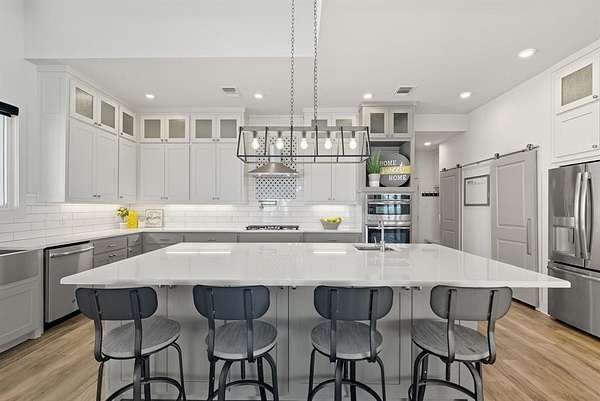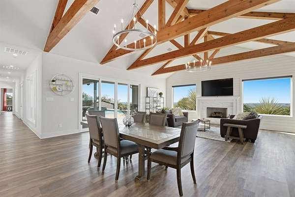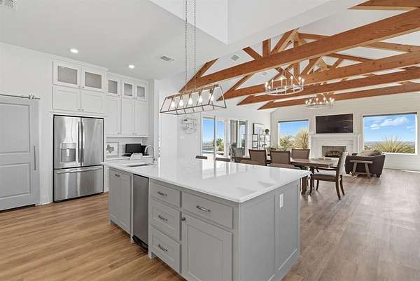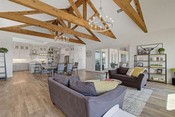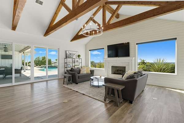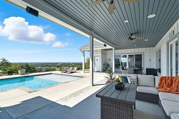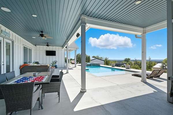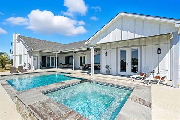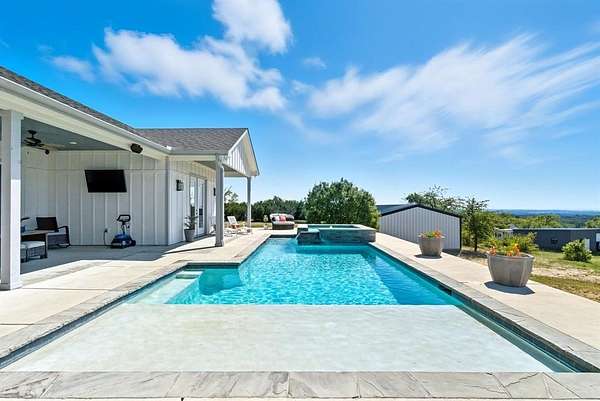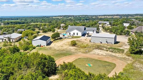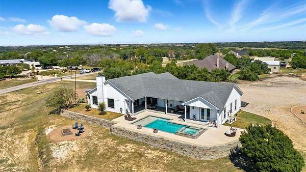 Set high on 2 acres, this stunning modern farmhouse was designed to capture the rolling Parker County countryside, it’s peaceful, elevated, and unforgettable. Upon entry into the home, you’re immediately captivated by soaring cathedral ceilings adorned with wood beams, massive windows, and French doors that dissolve the line between indoors and out. The living room flows into the open dining and on into the gorgeous chef’s kitchen. Let your culinary skills come to life with exceptional prep space on the expansive island, 2 sinks, a gas cooktop, and incredible cabinetry. Stroll down the light filled hallway to the primary suite, a sanctuary in its own, with private patio access, a spa inspired bath featuring a soaking tub, rain shower, and a dream-worthy custom closet with attached laundry. Two wonderful guest rooms, a large secondary full bath, and a pool bath complete the home. Outdoors is where life here truly shines, whether you’re hosting under the expansive covered porch, lounging by the sparkling pool and spa, or soaking in the views that stretch endlessly across the horizon where you can even see the distant Baker Hotel. The property also features a charming 1-bed, 1-bath guest quarters with a full kitchen and an attached 30x25 insulated and air conditioned shop. A separate 30x50 workshop currently serves as a batting cage, while beyond it, a private baseball field awaits. Whether you keep it as a field of dreams or transform it into your own haven, the possibilities are limitless. No HOA. Water well. Incredible location with easy access to major thoroughfares and minutes from Downtown Weatherford, shopping, dining, and entertainment.