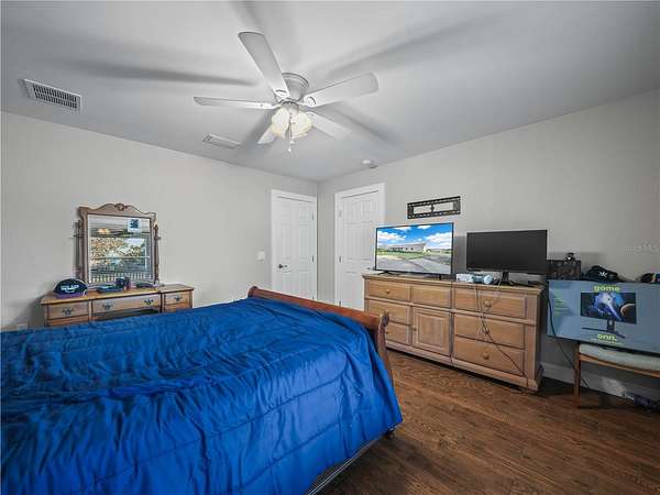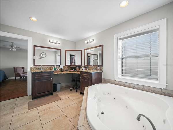 The main bedroom is a serene sanctuary with its own private lake view and sliding glass door that opens to a private lanai, offering a tranquil space to unwind. The main bedroom has on-suite bathroom, separate water closet, double sinks, jacuzzi tub, separate shower and double sinks. The second bedroom is thoughtfully designed with a dog door leading to secure dog fencing, making pet care effortless. The second and third bedrooms have walk in closets and share a convenient 2nd bathroom.