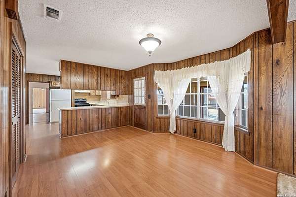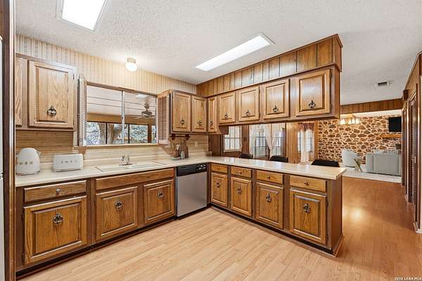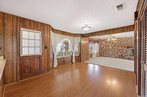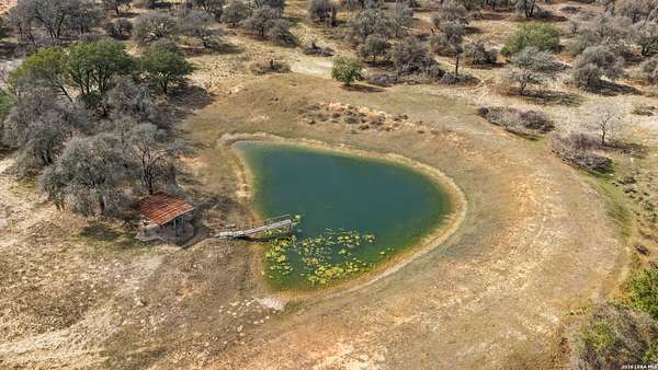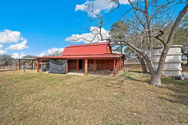 Under a canopy of sprawling oaks, where the breeze moves easily through the trees and ponds shimmer in the distance, this cherished Texas ranch invites you to slow down and stay awhile. Held in the same family for many years, this is the first opportunity to carry its legacy forward - a beautiful country setting ready for its next chapter and a buyer who will continue its story and traditions. A striking red metal roof crowns the stone exterior, rising from just over 79 acres of usable land that feel private, established, and full of possibility. Deer graze peacefully in the distance, stunning mature trees frame the landscape, and two stock ponds - one well-fed and one rain-fed - offer inviting places to fish, swim, or gather for easy summer picnics beneath a wide Texas sky. Inside, warm wood-look flooring leads into a welcoming living room anchored by a floor-to-ceiling stone fireplace and exposed beams - the kind of space where evenings stretch a little longer. The kitchen offers abundant cabinetry, generous counter space, and a breakfast bar that keeps everyone connected, whether it's morning coffee or a weekend gathering. With four bedrooms and two and a half baths, there's room for family, guests, hobbies, or a quiet home office. A long screened porch overlooks fenced and cross-fenced pastureland, while a barn with working pens and additional outbuildings support both ranching and recreation. Though it feels worlds away, convenient access to Highways 37 and 281 makes commuting simple, blending peaceful country living with everyday practicality. Please be aware that some photos have been virtually staged.