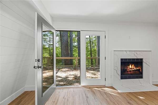 Create lasting memories of the great outdoors in this gem, tucked away in the tranquil woods of North Georgia. This fully renovated A-frame home sits on over 3 acres along the clear, rushing waters of Town Creek--with approximately 300 feet of private waterfront, a sparkling waterfall, and trout fishing right in your backyard. Inside, every detail has been reimagined in a top-to-bottom remodel, blending modern design with the home's classic mountain character. Gather in the open living area and kitchen, and relax fire-side in your cabin hideaway, with all new flooring and lighting throughout. Entertain guests or enjoy the solitude on the newly built open-air deck, perfect for a cup of coffee in the morning and stargazing at night. The brand-new designer kitchen is the heart of the home, with white shaker cabinets, quartz countertops, upgraded appliances (and beverage fridge), and sleek fixtures. Retreat to the main floor bedroom with new light/ceiling fan combo and new flooring. The beautifully renovated main floor bathroom includes designer marble tile, a quartz-topped extended vanity, and matte black accents. Upstairs, you'll find two additional bedrooms with new light/ceiling fan combo and flooring, highlighting the home's flexible bedroom arrangement. The spa-inspired shared bathroom upstairs features a walk-in glass shower and high-end finishes. Overall updates to the home include new windows and interior doors, new roof, new plumbing and electrical fixtures, new water heater and well pump, and fresh interior and exterior paint. Outside, wander through mountain laurel, ferns, and wildflowers to a soundtrack of the river and waterfall. Cast a line for trout or dip your toes in the cool water, enjoying the sanctuary that Town Creek offers. Just a short drive from Cleveland, Helen, and Dahlonega, with easy access to hiking, lakes, wineries, and shops--yet less than 90 minutes from Atlanta--this move-in-ready retreat offers the perfect blend of privacy, luxury, and adventure.