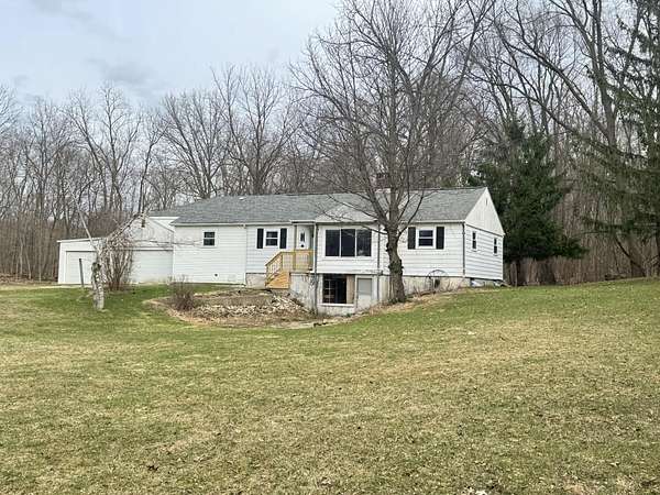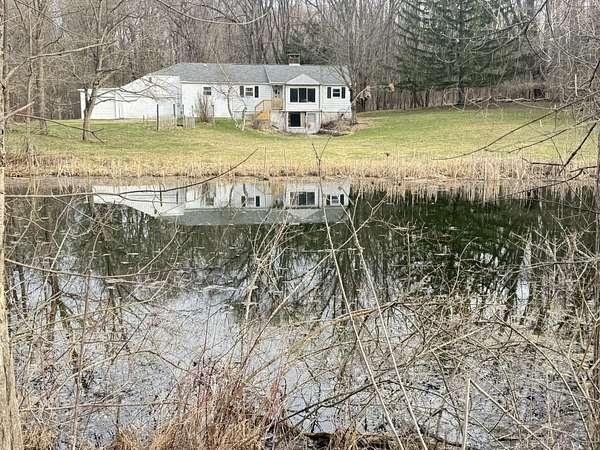 Escape to the serene beauty of this quiet country ranch home, perfectly situated on almost 6 acres of open space and secluded woods. This property offers the ultimate in privacy and peace, complete with two beautiful ponds (stocked with bass!) and stunning, picturesque views, especially during the vibrant spring and fall seasons, where you can watch the abundant wildlife. The home itself features a spacious and welcoming layout. The large living room is bathed in natural light thanks to a big picture window offering lovely views of the pond and surrounding trees. The eat-in kitchen flows into a versatile space currently used as a piano nook, which could easily serve as a formal dining area. The main level boasts three bedrooms, including the primary bedroom, all featuring large closets for ample storage, and two full bathrooms. Notable recent updates ensure peace of mind, including a new furnace and water heater in 2023, new kitchen windows in 2023, and a roof replacement in 2020. The living room and bedrooms feature heatshield windows for efficiency, and the home is equipped with a water softener and iron removal system, as well as an attic fan to keep the house cool during the summer. The partially finished, walk-out basement is a functional bonus space, featuring a laundry area, a cozy fireplace, extensive cupboard storage, a dedicated craft or hobby room, and another large picture window to enjoy the views. For comfort and security, the home includes backup electric heating in both the basement and upstairs. Outside, you'll find a one and a half-car attached garage with a door opener, supplemented by an attached but separate smaller one-car garage. The garage complex is a hobbyist's dream, featuring a massive workshop, a handy walk-in cedar closet and dog kennel/run. Additionally, the expansive property includes a wonderful sledding hill for winter fun and a 28x10x10-foot camper/boat/storage shed with electric and a capped-off well. Sold as one parcel, the home and 4.72 acres are combined with an adjacent 1.27-acre parcel featuring the shed. Despite the secluded feel, you are still close to amenities, the interstate, and entertainment. This home is full of opportunity and ready for your personal touches to make it your dream country sanctuary! A licensed agent must be present during showing. Buyer and buyer agent to verify all data/measurements. Schedule through showingtime.