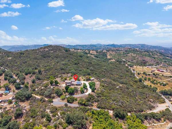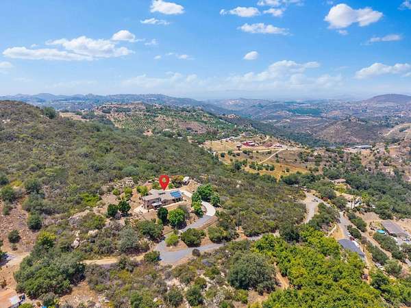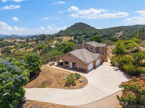 Welcome to your ultra-PRIVATE oasis on a spacious 4.32-acre lot in the heart of Valley Center. Refined country living with this exceptional estate, where timeless craftsmanship meets modern convenience. Nestled on a sprawling, private lot, this one-of-a-kind property offers serene surroundings, rolling hill views, spacious design, and elegant upgrades throughout. Inside, you'll find engineered hardwood floors, custom-crafted wooden door frames, and plantation shutters that exude charm and sophistication. The primary suite is conveniently located on the main level with a walk-in closet, offering comfort and privacy, along with a dedicated home office ideal for remote work or creative pursuits. Upstairs, you'll find two spacious guest bedrooms, an open loft area perfect for a media room or second living space, and two scenic balconies, one that overlooks the surrounding countryside and one private area. The expansive layout seamlessly connects indoor comfort to outdoor luxury, with two entertainer's patios, a private jacuzzi spa, and lush, manicured landscaping featuring blooming rose gardens and mature trees. Designed for both relaxation and functionality, the property boasts RV parking, solar system, newer tankless water heater, newer HVAC, soft water system, built-in BBQ, a 4-car garage, and three versatile sheds for storage, hobbies, or a future studio space. This is more than a home - it's a lifestyle. Conveniently located near new retail and shops by Park Circle!