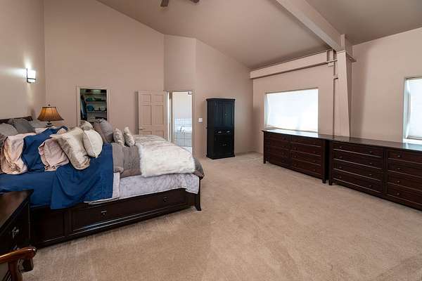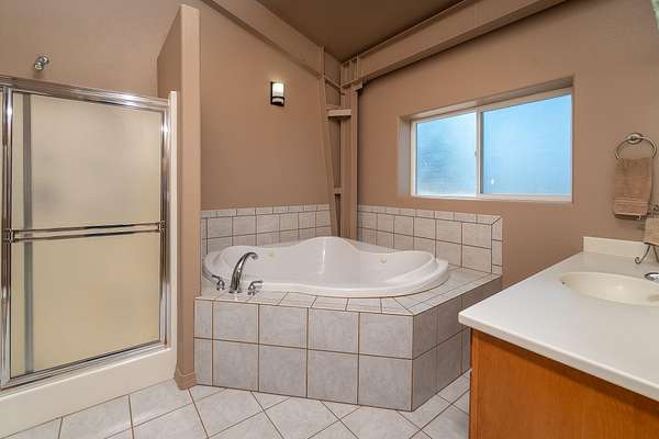 - Breakfast Bar, Ceiling Fan(s), Double Vanity, Fiberglass Stall Shower, Kitchen Island, Open Floorplan, Pantry, Primary Downstairs, Shower/Tub Combo, Soaking Tub, Solid Surface Counters, Vaulted Ceiling(s), Walk-In Closet(s)