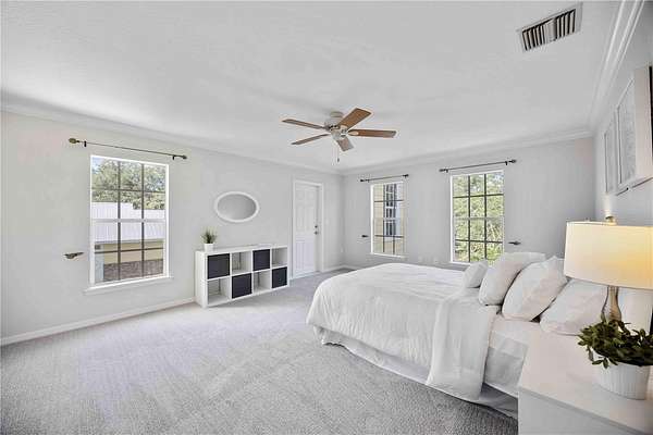 Discover a rare opportunity to own a privately gated waterfront estate on over two lush acres along Fox Creek in the equestrian-friendly community of Mission Valley Estates. Ideal for professionals, families, or hobbyists, this property offers both elegance and functionality. Beyond the wrought-iron gates lies a separate carriage house featuring an air-conditioned four-car garage, workshop, full bath, kitchenette, and an upstairs bonus room--perfect for an office, guest space, or hobby area. This additional 2,195 sq. ft. is ideal for storing cars, RVs, boats, and more. The stately main residence spans over 6,300 sq. ft., with 4,741 sq. ft. under air. It features four spacious bedrooms (with potential for a fifth), four and a half bathrooms, a library with built-ins, a media room, and beautiful architectural details including crown molding, vaulted ceilings, and wrap-around porches. The updated kitchen boasts soft-close cabinetry, stainless appliances (including dual refrigerators and a new range), and a walk-in pantry with wood shelving. Entertain with ease in the large dining room, enhanced by custom built-ins, wainscoting, and a wood-burning fireplace. Outside, enjoy a resurfaced saltwater pool and spa, pavered lanai, and a peaceful setting with boatable water access and a private dock. Tucked away yet conveniently located near Gulf beaches, top-rated schools, parks, shopping, dining, and highways--this hidden gem offers the perfect balance of privacy, luxury, and accessibility. Come see it today.