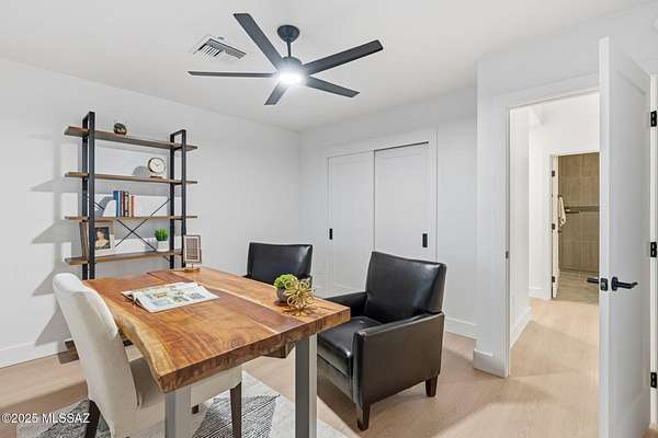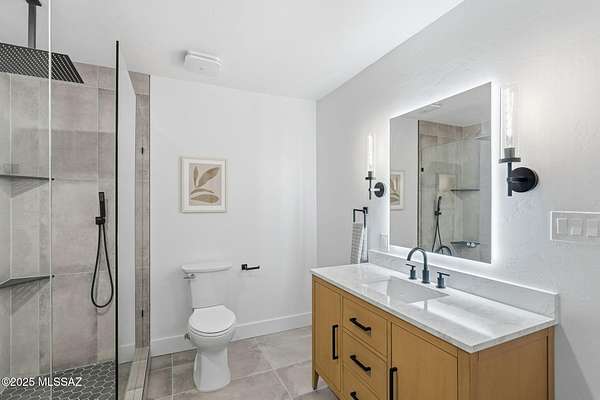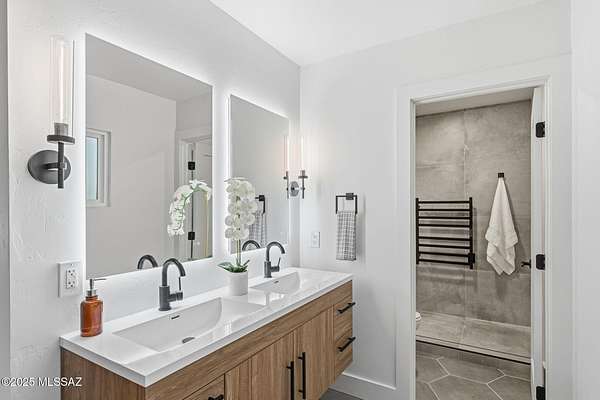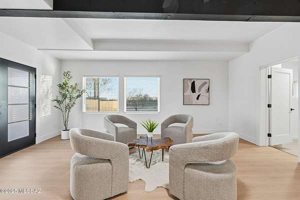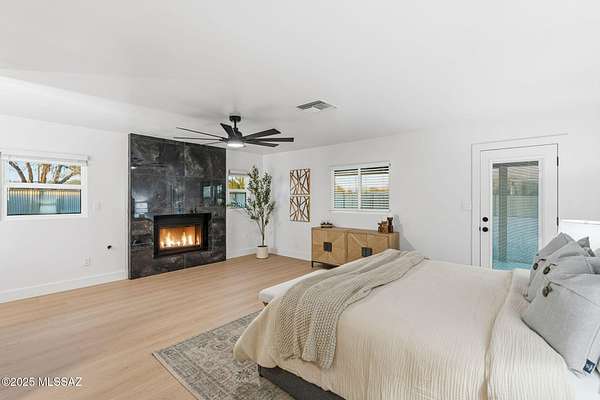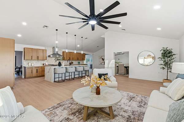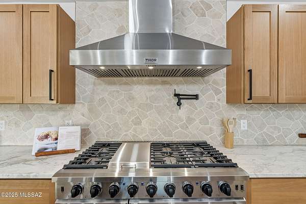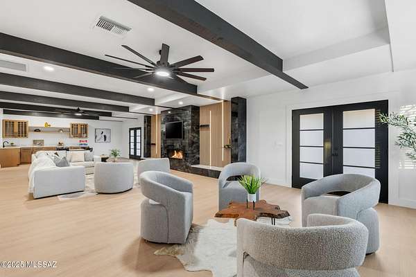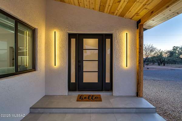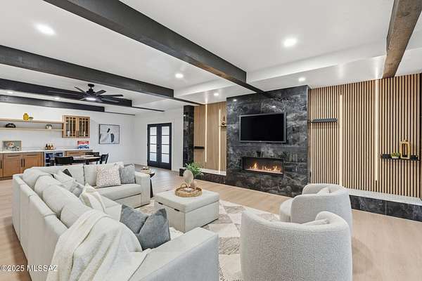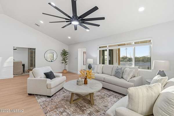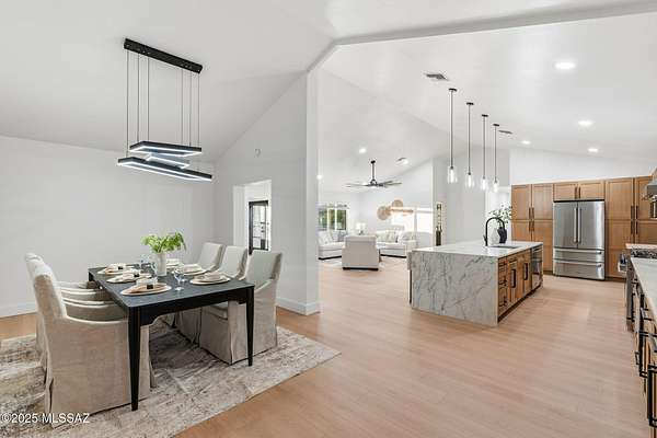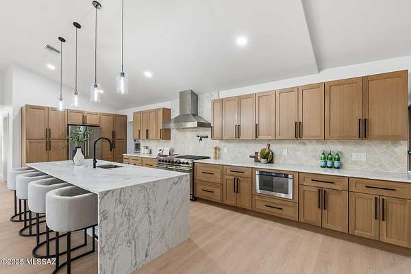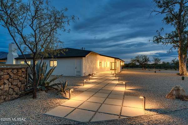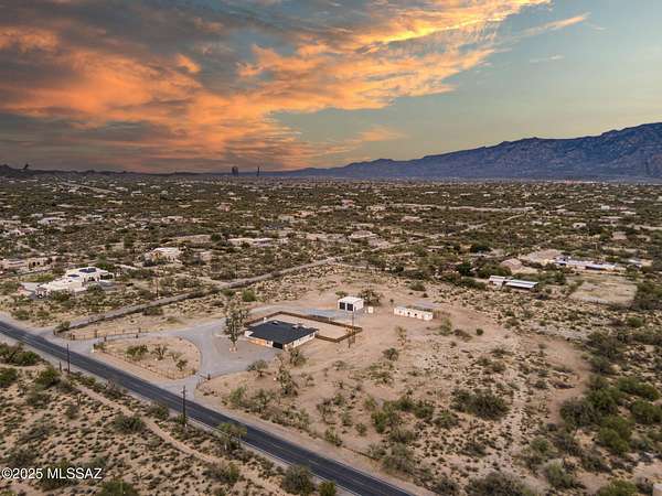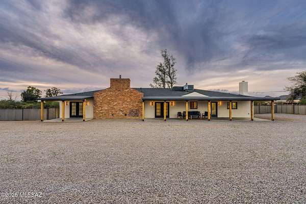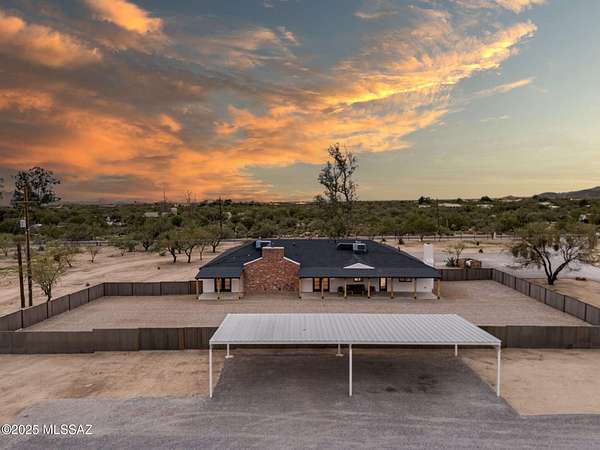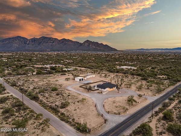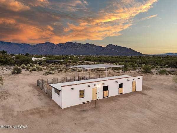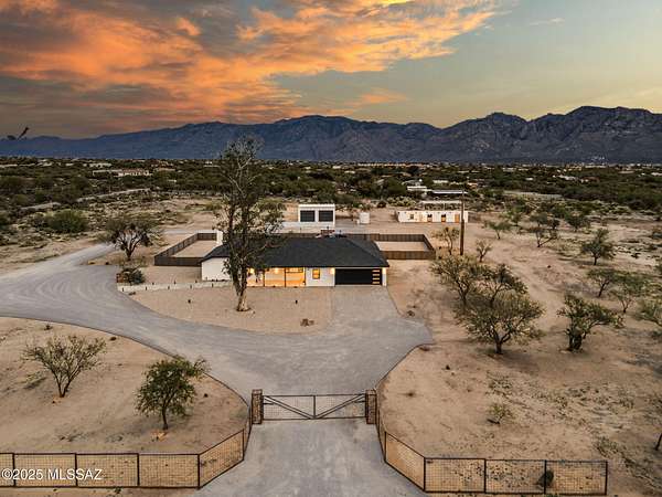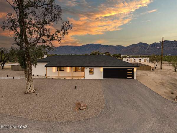 Experience classic Sonoran Desert living in this completely renovated ranch-style home set on 9+ expansive acres in coveted Oro Valley. Located near La Cholla Airpark, this exceptional horse property offers a rare balance of privacy, tranquility, and everyday convenience. It is minutes from shopping, dining, and amenities, yet offers the peaceful feel of true country living. Framed by breathtaking panoramic views of the Catalina Mountains and Pusch Ridge, the property invites you to slow down and savor the natural beauty that surrounds you. Enjoy sunrise coffee on the back patio, or sunset evenings from the expansive front porch, where open skies and desert serenity stretch in every direction. With abundant usable acreage, the possibilities are endless and perfect for equestrian use, additional structures, or future expansion. The grounds feature horse stables, ample space for riding and training, gabion pillar fencing, a 2-bay RV garage, and an additional 4 bay carport, making this property as functional as it is picturesque. The newly replaced roof is finished with Timberline algae-resistant architectural shingles, adding both durability and peace of mind. Inside, the home has been thoughtfully and extensively reimagined with a reconfigured floorplan and raised ceilings, creating a bright, open, and welcoming atmosphere. All-new interior drywall and Sherwin-Williams designer paint provide a clean, modern backdrop, complemented by new doors, updated lighting, and contemporary fixtures throughout. Comfort and efficiency were prioritized with new dual-pane windows, smart thermostats, a new garage door, and a fresh epoxy-coated garage floor. Every detail reflects quality craftsmanship and intentional design. At the heart of the home, the chef's kitchen is a true statement space, featuring solid wood custom cabinetry with dovetail drawers and soft-close hardware, a dramatic honed Matarazzo Quartzite waterfall island, and a complete suite of Thor appliances -- perfect for both daily living and entertaining. The floor plan flows seamlessly into the main living area, anchored by a striking Empire Loft 46" millivolt vent linear natural gas fireplace, enhanced with Woodupp wood slat accents that add warmth, texture, and architectural interest. A wet bar rounds out this gathering area. The property is supported by a private well and a propane tank. This is a truly rare Oro Valley gem, offering a turnkey, extensively upgraded ranch home on acreage, ideal for horse enthusiasts, aviation lovers, or anyone seeking space, views, and serenity, all while remaining conveniently connected to everything the Tucson area has to offer.