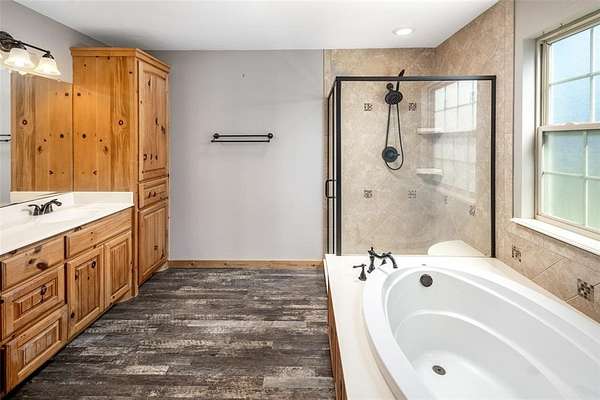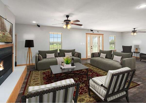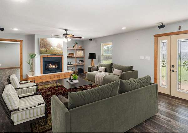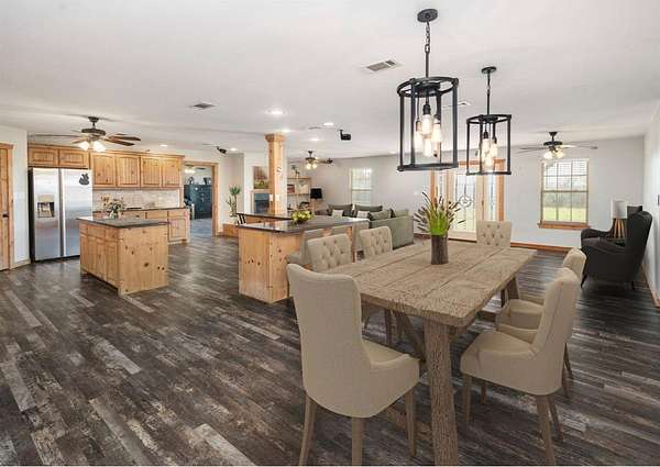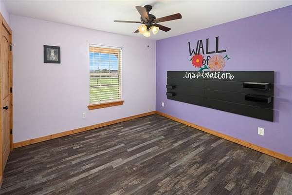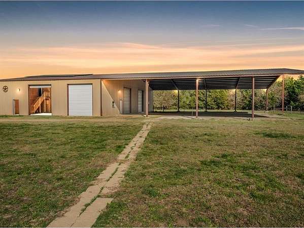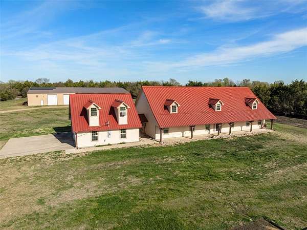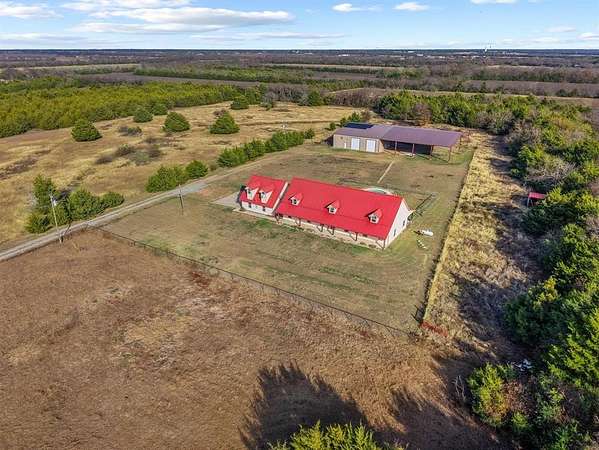 MOTIVATED SELLER!! Discover the ultimate North Texas ranch lifestyle! Tucked away on over 18 pristine acres with a spring-fed pond, this unique property offers a blend of serene country living and incredible business potential.For the entrepreneur, the impressive 60'x90' enclosed shop is ready for business with 16-ft walls, five 14-ft roll-up doors, a car lift, and a basketball goal. The shop also includes living quarters with a kitchen and full bath. Under the same roof, an 80'x90' covered area and RV hookup add endless possibilities--from a party barn event center to a private equestrian arena. The land is fully fenced and cross-fenced with a loafing shed and hog barn. A gated entry and winding drive lead you to a stunning hill country style home with a total of over 5,000 sq ft of living space combined between the main home, living space above detached garage and apartment located in the shop, meticulously designed for both comfort and large-scale entertaining. Hosting is a delight in the open-concept living, kitchen, and dining areas, highlighted by an inviting fireplace and custom lighting. The expansive kitchen is a chef's dream with beautiful cabinetry, generous counter space, and a large walk-in pantry. Four spacious bedrooms are located on the main floor, including a luxurious primary suite complete with a fireplace, large ensuite, gun safe, and walk-in closet. The upper level is dedicated to fun and entertainment, featuring a gorgeous media room and a massive game room perfect for all ages. Above the two-car garage, a versatile flex space is currently used as a home gym.