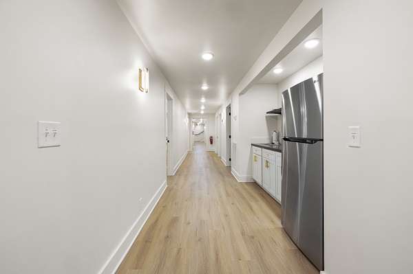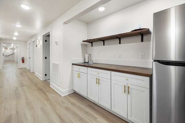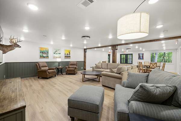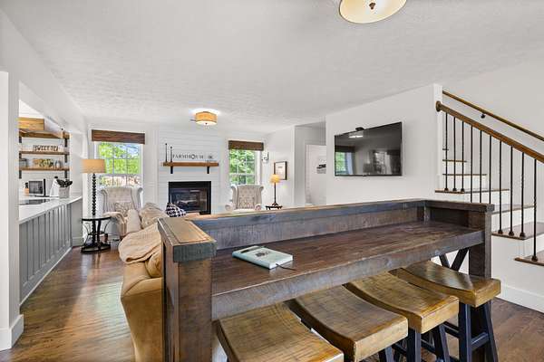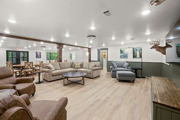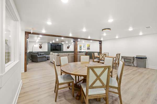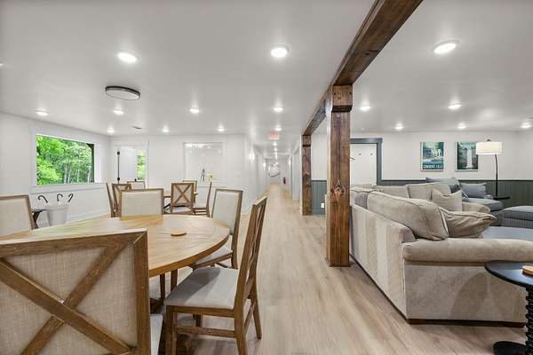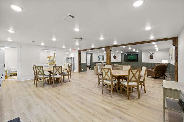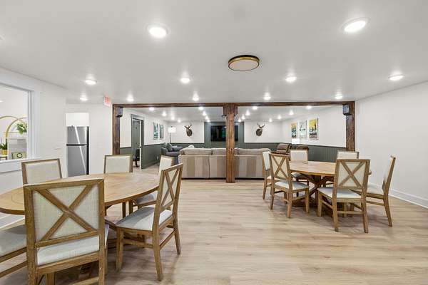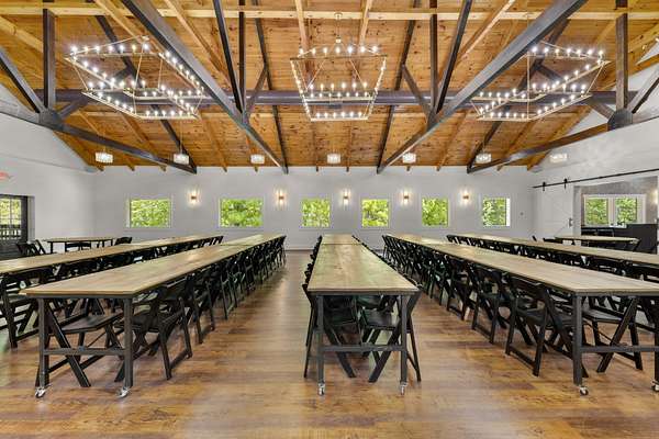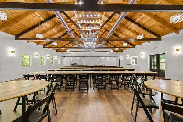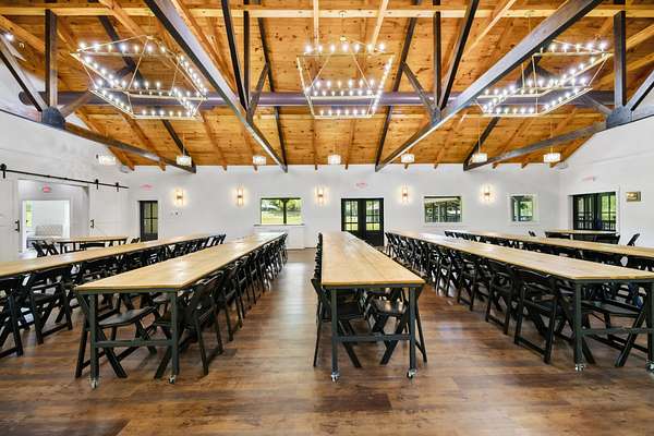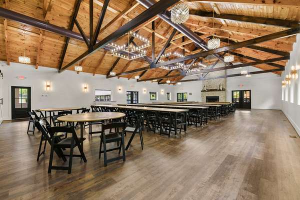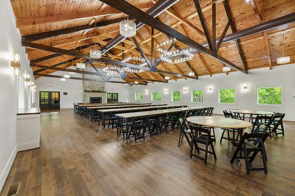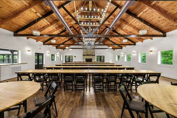 At the heart of the property is a stunning reception hall accommodating up to 150 guests, featuring vaulted ceilings, a grand fireplace, and custom-made tables and chairs designed specifically for the space. A connected banquet hall supports buffets, bar service, and group breakfasts, allowing events to flow efficiently while maintaining a polished guest experience.