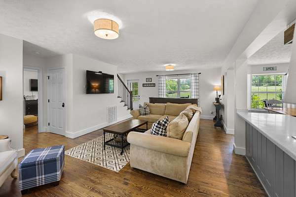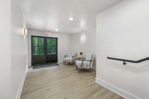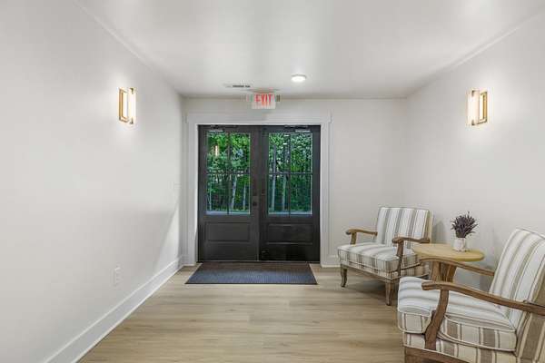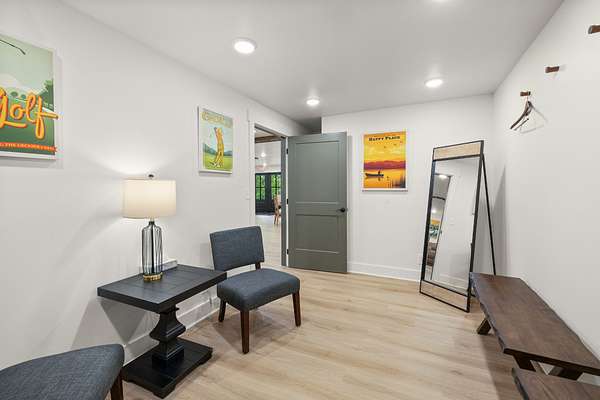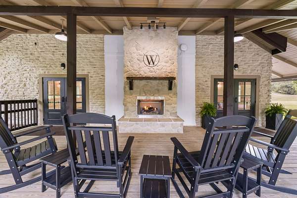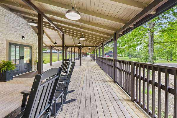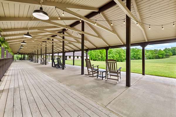Outdoor amenities include a manicured courtyard ideal for ceremonies and cocktail hours, a picturesque pondside ceremony site offering serene water views, and an expansive event lawn surrounded by mature greenery. A 140-foot covered porch with Edison lighting provides ambiance, weather protection, and an inviting space for guests to relax and socialize.