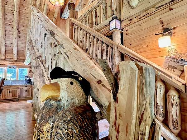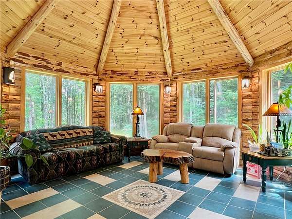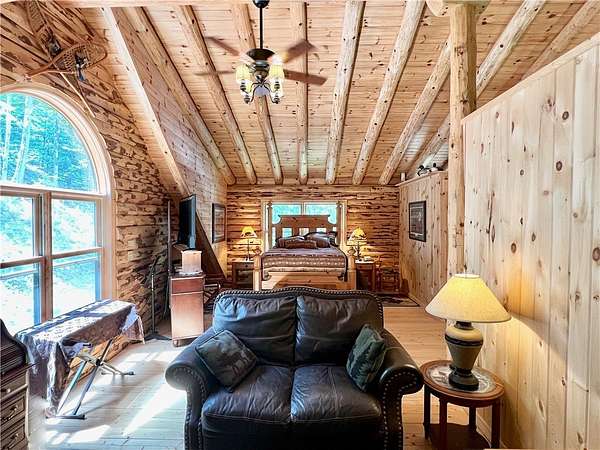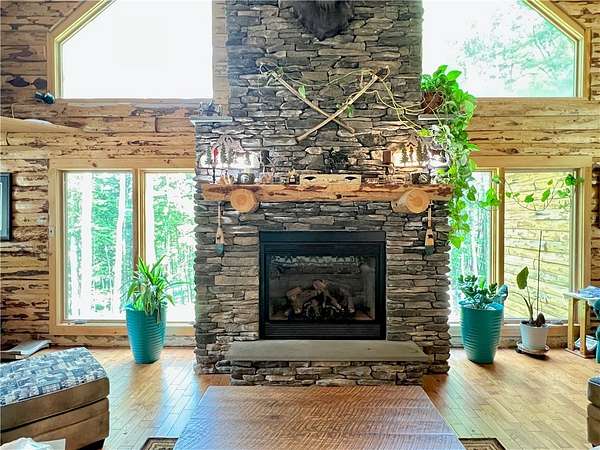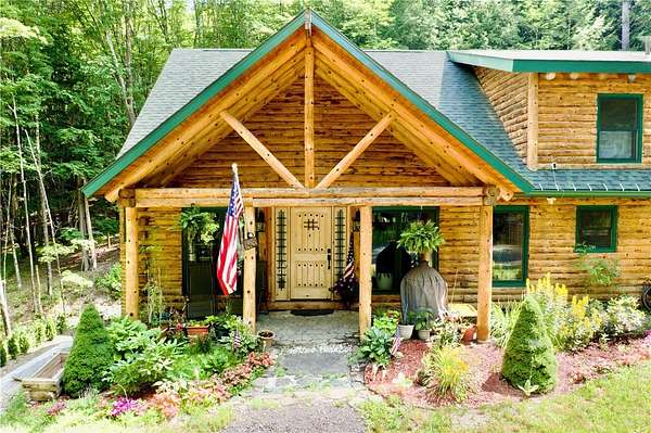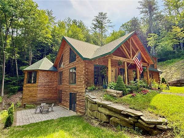 Welcome to your dream home in the woods - a one-of-a-kind custom-built Lok-N-Logs log home, inspired by Frank Lloyd Wright's Fallingwater. This home blends seamlessly into the property's serene, private 6.36-acre wooded lot featuring a year-round waterfall. Crafted in 2002, this home features kiln-dried, pressure-treated pine logs and insulated tongue-and-groove construction, built to exceptional standards with meticulous attention to detail. Every square inch reflects quality, from solid wood doors to top-of-the-line appliances, windows, and fixtures. This almost 2200 square foot 3-bedroom, 3.5-bath home has expansion potential for an apartment, studio, rec room, or more living space with its walk-out basement. The heart of the home is the breathtaking 23-foot cathedral-ceiling great room, anchored by a hand-built natural stone, propane fireplace, and framed with exposed beams. This sun-filled space includes an extra-large dining area and kitchen featuring hickory cabinets, a granite countertop, ceramic tile backsplash, a breakfast bar, and oak hardwood floors. The first-level homeowner's suite is a private sanctuary with beautiful views out the sliding door. Unique, versatile octagon room overlooks the property's waterfall and serves as a perfect office, studio, or meditative space. The spacious loft features two bedrooms, sitting areas, and another full bath. This architectural masterpiece is conveniently located between Oneonta and Cooperstown. If you're looking for privacy, timeless craftsmanship, peaceful surroundings, and a home that feels truly one with nature, THIS IS IT! Call today for your private showing.