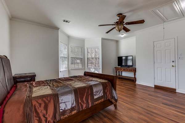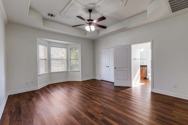 - Bookcases, Ceiling Fan(s), Ceiling-High, Crown Molding, In-Law Floorplan, Kitchen Island, Primary Bedroom On Main, Recessed Lighting, Track Lighting, Tray Ceiling(s), Two Primary Suties, Walk-In Closet(s)