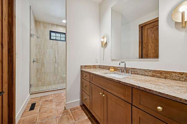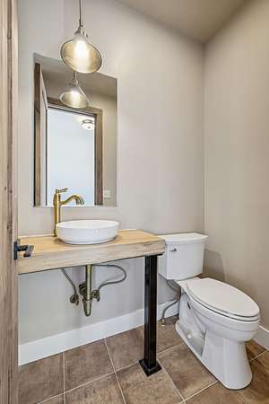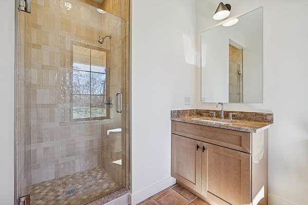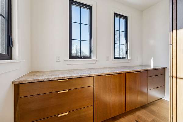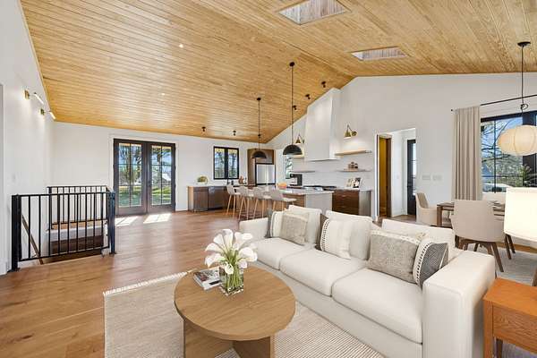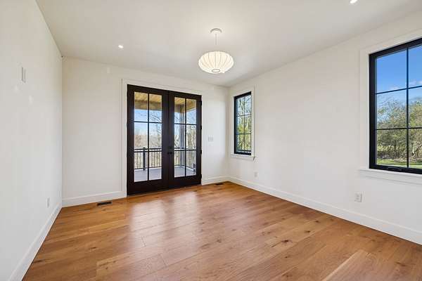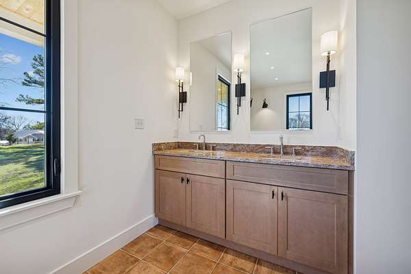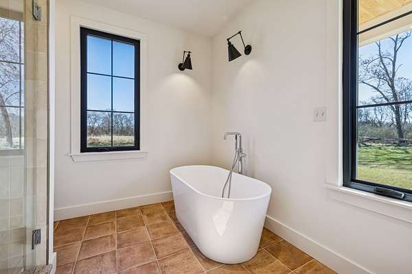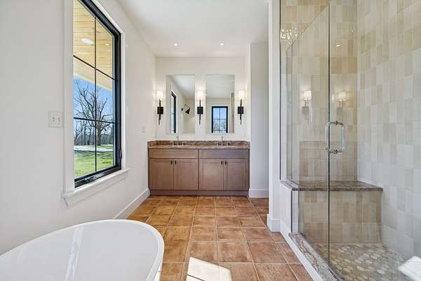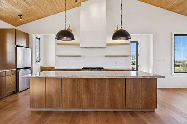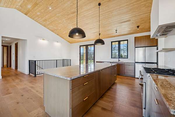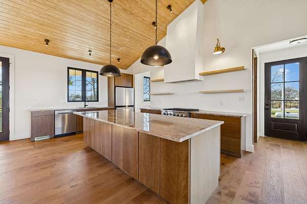 The kitchen is well-appointed with a large breakfast bar, 36" gas range with 6 burners, and an impressive custom pantry. The primary suite offers a private entrance to the back porch, walk-in closet, free-standing tub, and tiled shower. Both secondary bedrooms feature private en-suite baths.