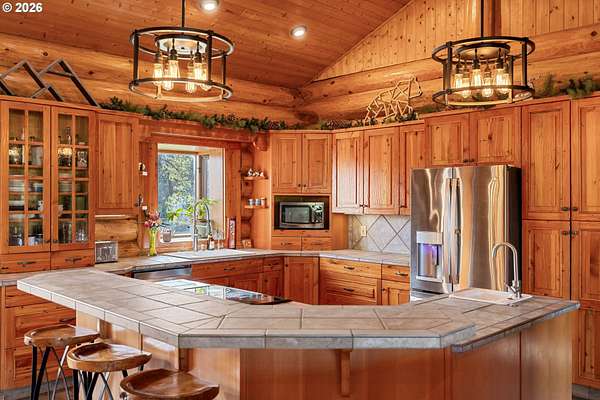 - Cook Island, Dishwasher, Down Draft, Free Standing Range, Free Standing Refrigerator, Pantry, Stainless Steel Appliance, Tile, Water Purifier