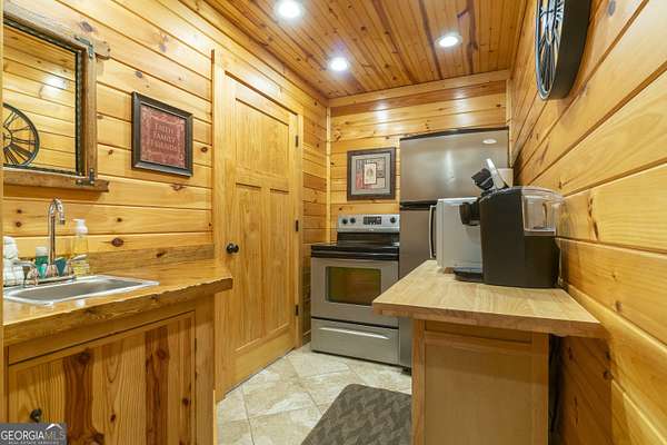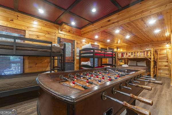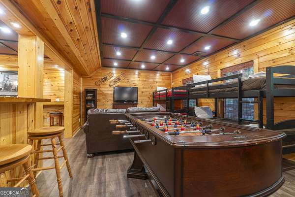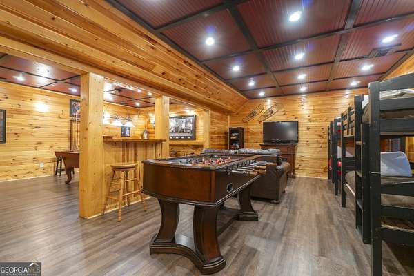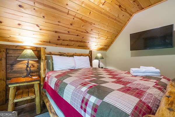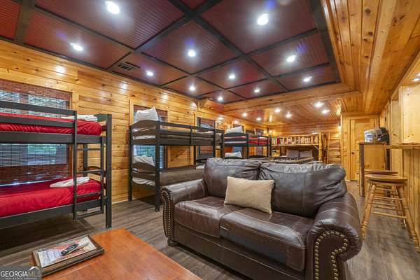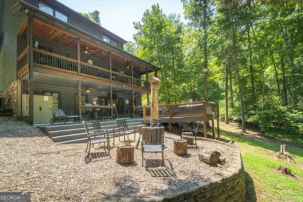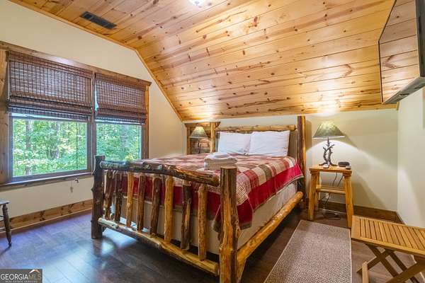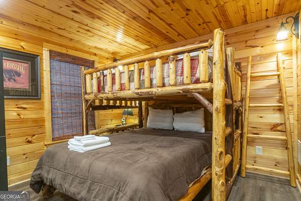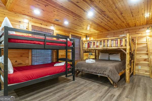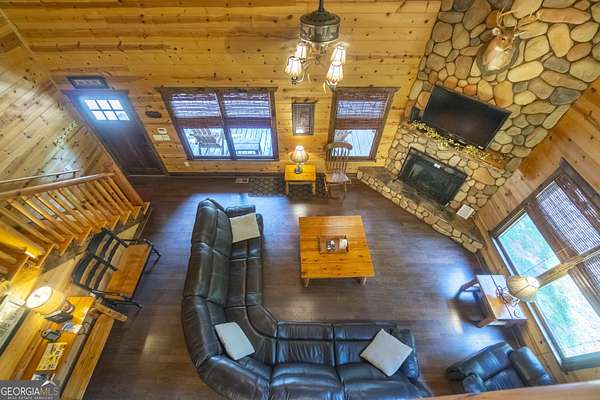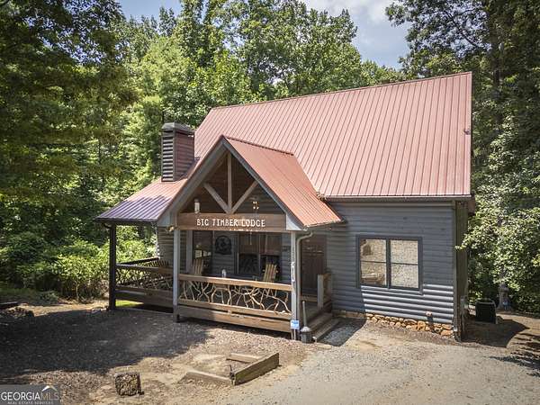 Are you looking for an ACTIVE SHORT TERM RENTAL PROPERTY with great Annual Gross income? Don't miss the opportunity for "BIG TIMBER" to be yours!! "BIG TIMBER" aptly describes this log sided home with very low maintenance & easy care, all wood interior. Spacious open floor plan that is perfect for Full time living with lots of space for everyone or makes for a GREAT SHORT-TERM RENTAL. This is currently an ACTIVE Short-Term Rental (STR) property with a TRANSFERABLE host license! Situated on 3.8 acres which includes frontage and partial ownership of a pond for fishing and boating. Guests stay here just to experience a private pond for canoeing and fishing. You'll be awed upon first entry as you are met with vaulted ceilings creating a spacious atmosphere that goes on and on. Lots of windows let in lots of light! Hardwood Floors and granite counters complement the comfortable furniture and decor planned with STR in mind. A covered back porch overlooks the patio area with hot tub and fire pit below. The "rocking chair front porch" is well suited for rocking the hours away and enjoying the mountain breezes. Primary BR is on the main level with ensuite bath, tile shower and jetted soaking tub. Spacious laundry room and a 1/2 bath complete the main floor. Upper level has a sleeping loft and 2 additional bedrooms along with a spacious full bath. Come on Down...to the Game room/Bunk room! This lower level has a full-sized pool table, a bar, a separate kitchen, full bath, foosball table, fireplace and 8 bunk beds! The home has room for extended family visits and for church or civic organizations to host a retreat. Water is provided by a shared community well. Septic tank is rated for a 3 BR. Furnishings are negotiable.