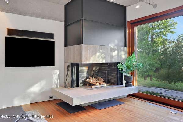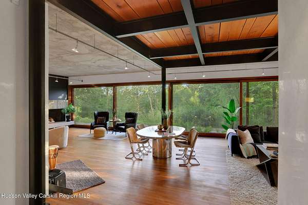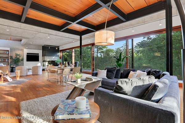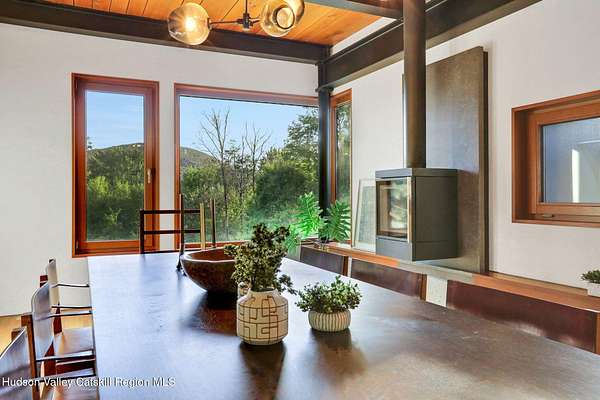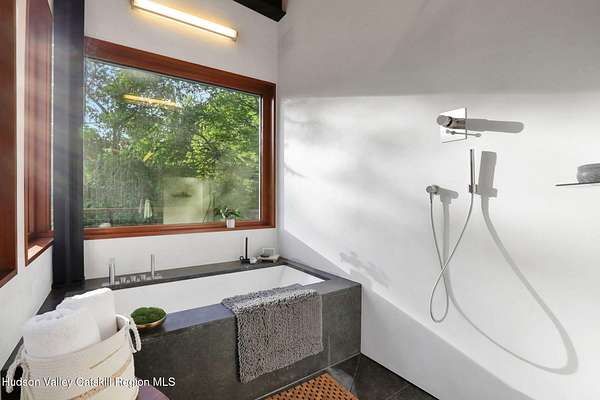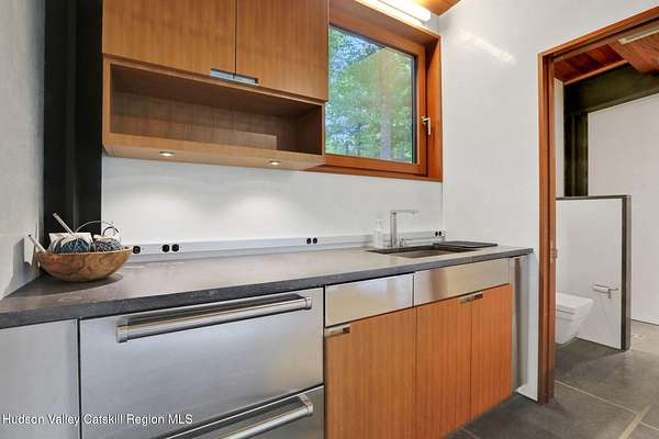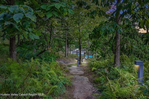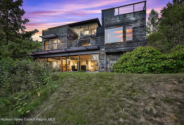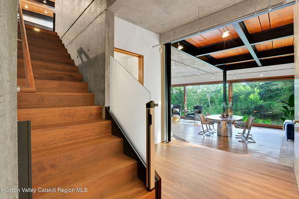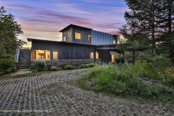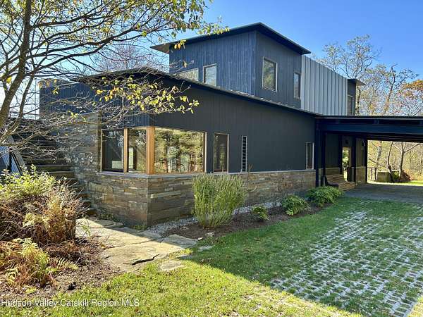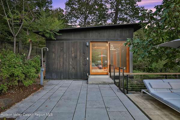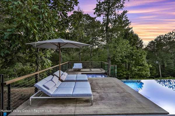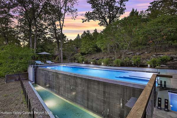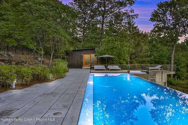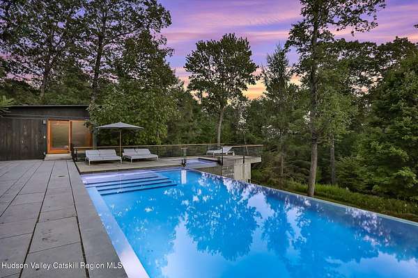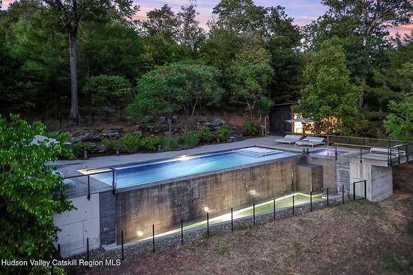 Welcome to Nature's Edge -- a Woodstock estate, where wilderness meets luxury. Perched at the end of a secluded private road, this modern mountain marvel offers unmatched privacy, serenity, and grandeur. Surrounded by natural woodscapes and native rock outcroppings, this 40 acre property sits adjacent to over 500 acres of forever wild NYC DEP land. The home itself, a Barry Price architectural masterpiece, will leave you questioning all you thought you knew about design. Featured in several publications, the details of this home include locally sourced and regionally crafted materials such as board formed concrete, epoxy coated structural steel, reclaimed black walnut, stainless steel, Onondaga limestone and lime based plaster walls all while maximizing the provision of thermal insulation and passive solar gain--comfort and energy efficiency. Within the 4600 square feet of living space, the home has 3 floors, each with its own bedroom and bathroom suite with custom cabinetry throughout. With an abundance of natural light, the timeless open-concept kitchen features a massive island, Wolf, Sub-Zero and Miele stainless steel appliances, oversized sink, espresso machine, and more. Step down into the sunken dining room with a wine refrigerator, ice machine, cold storage, and floating wood stove, surrounded by mountain views. On the lower level you will find the sprawling living spaces with continued details a plenty. A stylish wood burning fireplace, wet bar, and sophisticated media room. This home features whole-house automation. Lighting, shades, heating and cooling, etc. The expansive CASE doors and windows allow you to take in the undeveloped mountain sides natural features--a proper indoor/outdoor living experience. Continue to take in the scenery as you meander down the stone path to the breathtaking 52' x 17' vanishing edge pool, 8' x 8' vanishing edge spa, outdoor shower, and 224 square foot pool house. Equipped with the same finishes, the pool house offers an open area with massive sliding glass doors, full bathroom, refrigerator and freezer drawers, and mini split. Completely private, yet located just minutes from the heart of Woodstock. Enjoy all this vibrant community has to offer whether it's by way of the abundance of quality restaurants, shops, galleries, events, shows, and more. A short distance to many of the Hudson Valley's popular neighboring towns as well, Saugerties, Kingston, Phoenicia, Hunter, Windham, etc. while just over 2 hours to New York City.