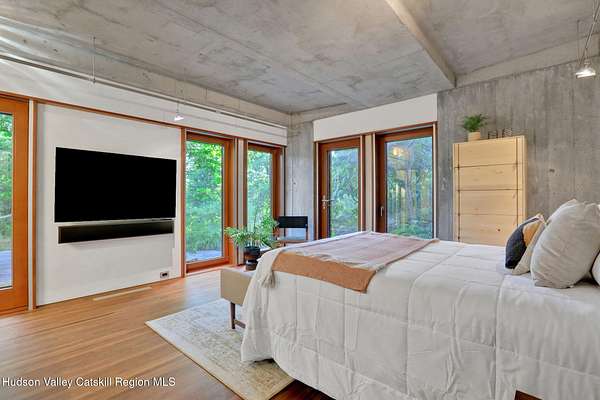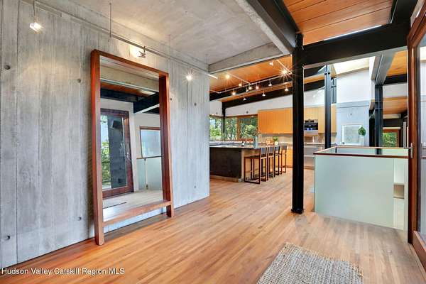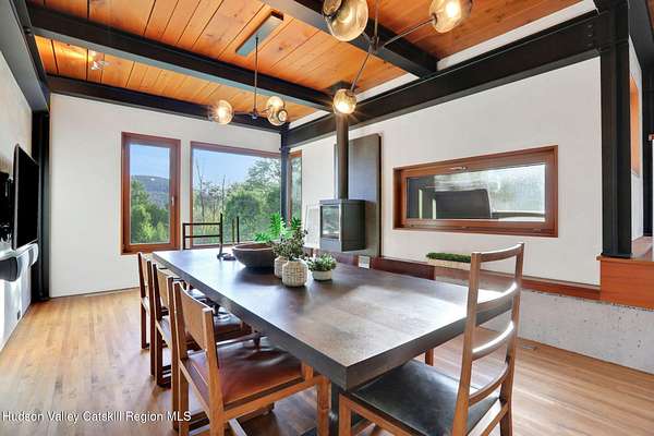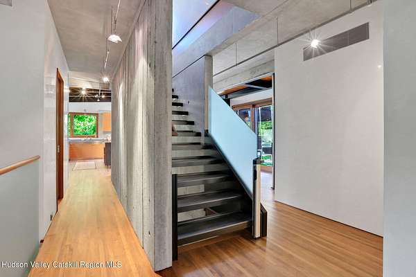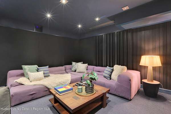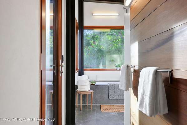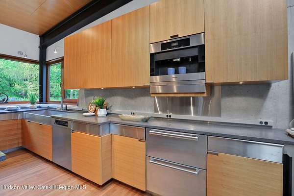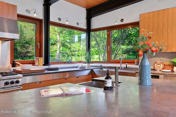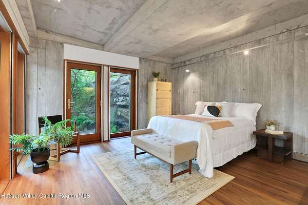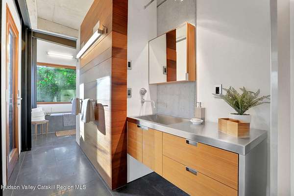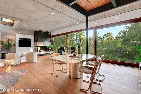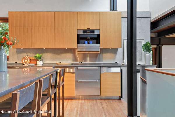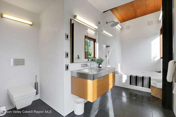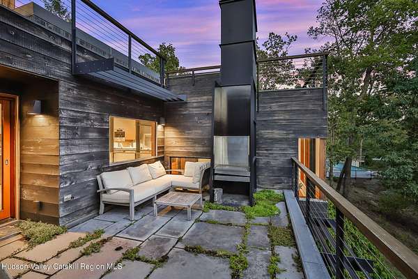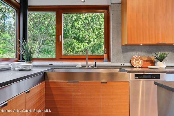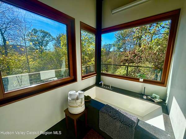 Welcome to Nature's Edge -- a Woodstock estate, where wilderness meets luxury. Perched at the end of a secluded private road, this modern mountain marvel offers unmatched privacy, serenity, and grandeur. Surrounded by natural woodscapes and native rock outcroppings, this 40 acre property sits adjacent to over 500 acres of forever wild NYC DEP land. The home itself, a Barry Price architectural masterpiece, will leave you questioning all you thought you knew about design. Featured in several publications, the details of this home include locally sourced and regionally crafted materials such as board formed concrete, epoxy coated structural steel, reclaimed black walnut, stainless steel, Onondaga limestone and lime based plaster walls all while maximizing the provision of thermal insulation and passive solar gain--comfort and energy efficiency. Within the 4600 square feet of living space, the home has 3 floors, each with its own bedroom and bathroom suite with custom cabinetry throughout. With an abundance of natural light, the timeless open-concept kitchen features a massive island, Wolf, Sub-Zero and Miele stainless steel appliances, oversized sink, espresso machine, and more. Step down into the sunken dining room with a wine refrigerator, ice machine, cold storage, and floating wood stove, surrounded by mountain views. On the lower level you will find the sprawling living spaces with continued details a plenty. A stylish wood burning fireplace, wet bar, and sophisticated media room. This home features whole-house automation. Lighting, shades, heating and cooling, etc. The expansive CASE doors and windows allow you to take in the undeveloped mountain sides natural features--a proper indoor/outdoor living experience. Continue to take in the scenery as you meander down the stone path to the breathtaking 52' x 17' vanishing edge pool, 8' x 8' vanishing edge spa, outdoor shower, and 224 square foot pool house. Equipped with the same finishes, the pool house offers an open area with massive sliding glass doors, full bathroom, refrigerator and freezer drawers, and mini split. Completely private, yet located just minutes from the heart of Woodstock. Enjoy all this vibrant community has to offer whether it's by way of the abundance of quality restaurants, shops, galleries, events, shows, and more. A short distance to many of the Hudson Valley's popular neighboring towns as well, Saugerties, Kingston, Phoenicia, Hunter, Windham, etc. while just over 2 hours to New York City.
