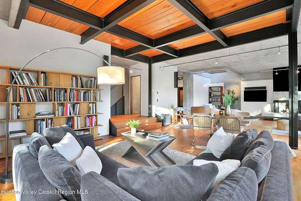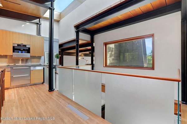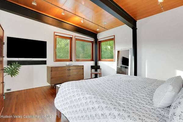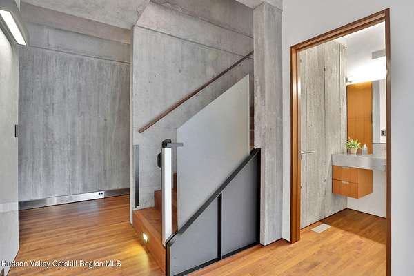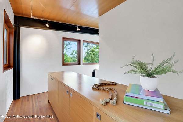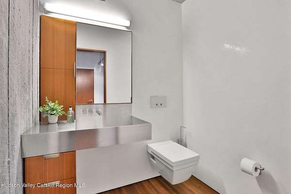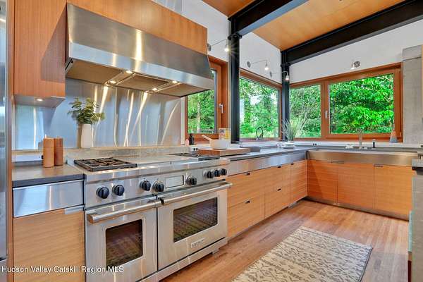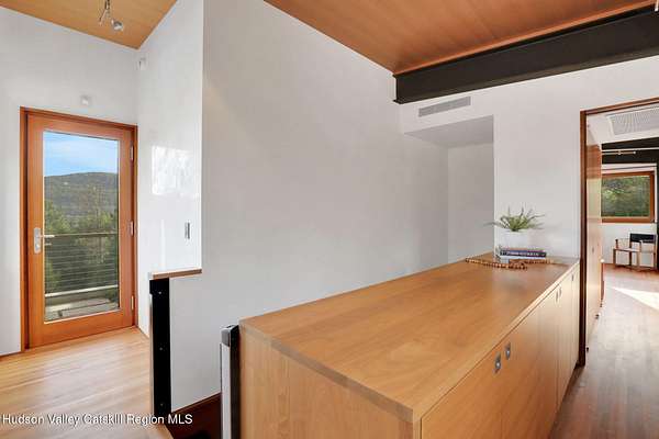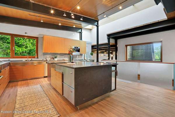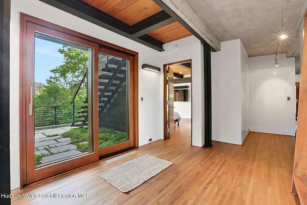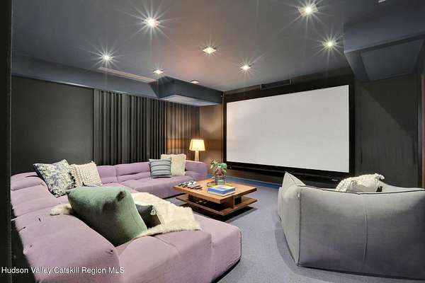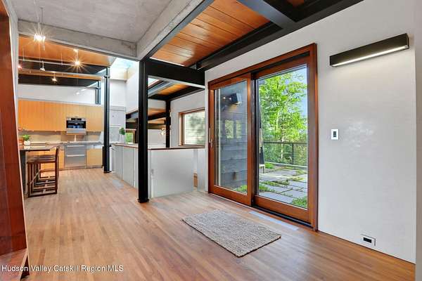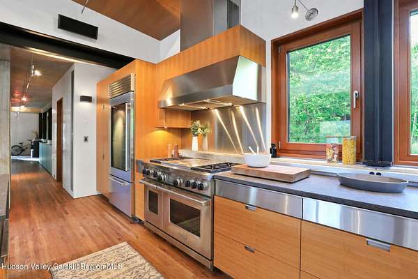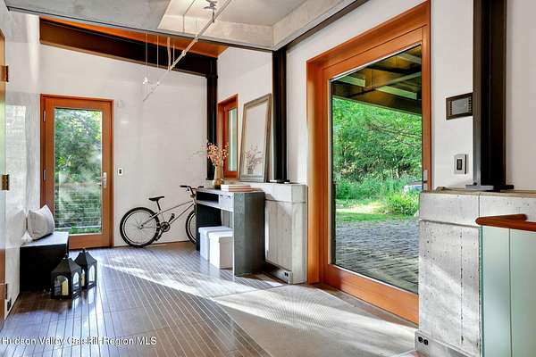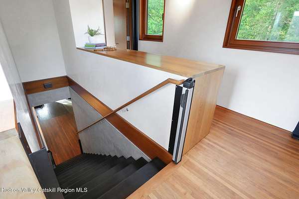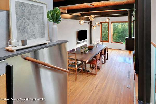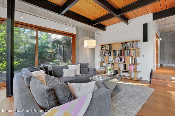 Welcome to Nature's Edge -- a Woodstock estate, where wilderness meets luxury. Perched at the end of a secluded private road, this modern mountain marvel offers unmatched privacy, serenity, and grandeur. Surrounded by natural woodscapes and native rock outcroppings, this 40 acre property sits adjacent to over 500 acres of forever wild NYC DEP land. The home itself, a Barry Price architectural masterpiece, will leave you questioning all you thought you knew about design. Featured in several publications, the details of this home include locally sourced and regionally crafted materials such as board formed concrete, epoxy coated structural steel, reclaimed black walnut, stainless steel, Onondaga limestone and lime based plaster walls all while maximizing the provision of thermal insulation and passive solar gain--comfort and energy efficiency. Within the 4600 square feet of living space, the home has 3 floors, each with its own bedroom and bathroom suite with custom cabinetry throughout. With an abundance of natural light, the timeless open-concept kitchen features a massive island, Wolf, Sub-Zero and Miele stainless steel appliances, oversized sink, espresso machine, and more. Step down into the sunken dining room with a wine refrigerator, ice machine, cold storage, and floating wood stove, surrounded by mountain views. On the lower level you will find the sprawling living spaces with continued details a plenty. A stylish wood burning fireplace, wet bar, and sophisticated media room. This home features whole-house automation. Lighting, shades, heating and cooling, etc. The expansive CASE doors and windows allow you to take in the undeveloped mountain sides natural features--a proper indoor/outdoor living experience. Continue to take in the scenery as you meander down the stone path to the breathtaking 52' x 17' vanishing edge pool, 8' x 8' vanishing edge spa, outdoor shower, and 224 square foot pool house. Equipped with the same finishes, the pool house offers an open area with massive sliding glass doors, full bathroom, refrigerator and freezer drawers, and mini split. Completely private, yet located just minutes from the heart of Woodstock. Enjoy all this vibrant community has to offer whether it's by way of the abundance of quality restaurants, shops, galleries, events, shows, and more. A short distance to many of the Hudson Valley's popular neighboring towns as well, Saugerties, Kingston, Phoenicia, Hunter, Windham, etc. while just over 2 hours to New York City.