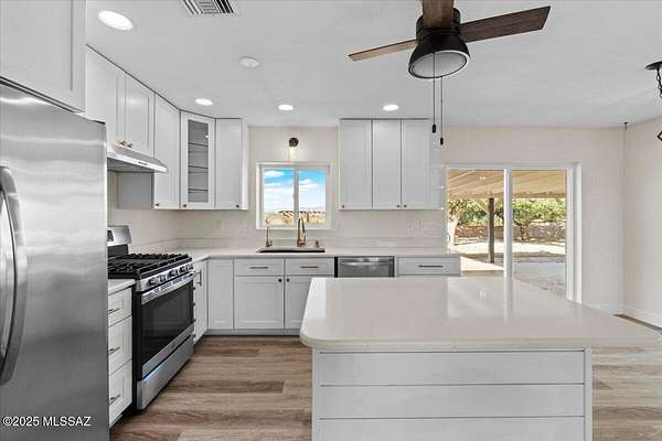Step outside to covered patios in both the front and back, ideal for relaxing or entertaining year-round. The backyard is fully enclosed with a stucco wall for privacy, and a powered storage shed adds convenience for tools, hobbies, or extra storage. This property blends space, style, and flexibility in a peaceful setting