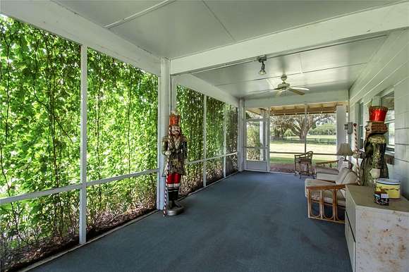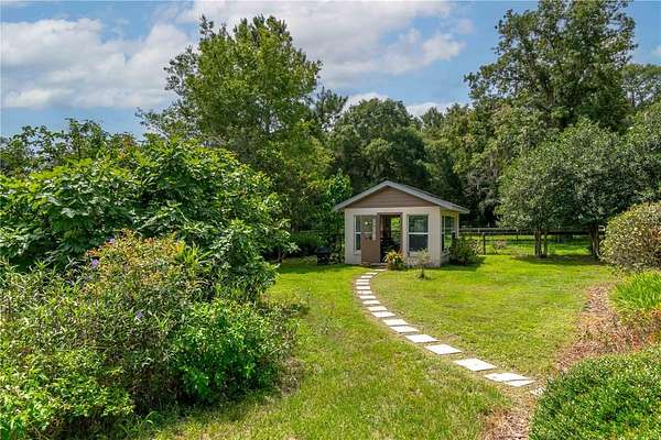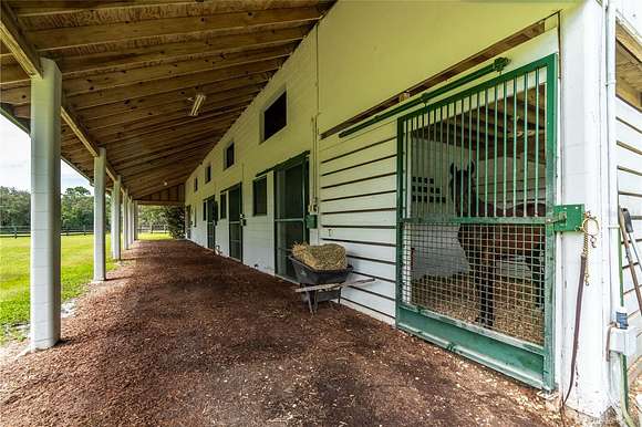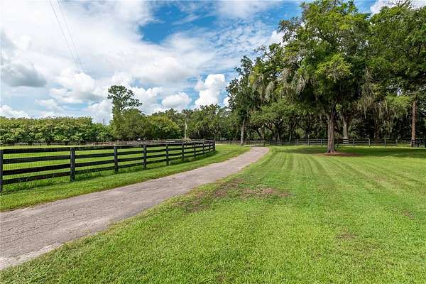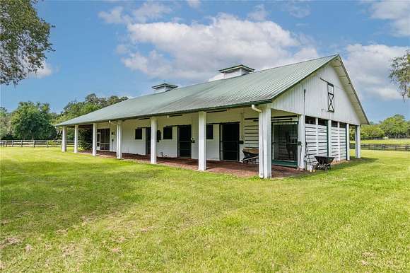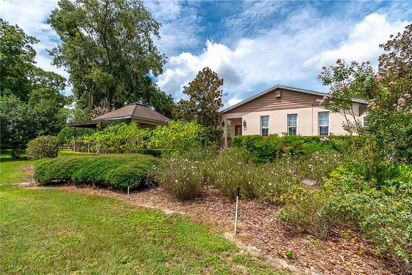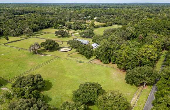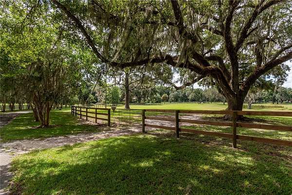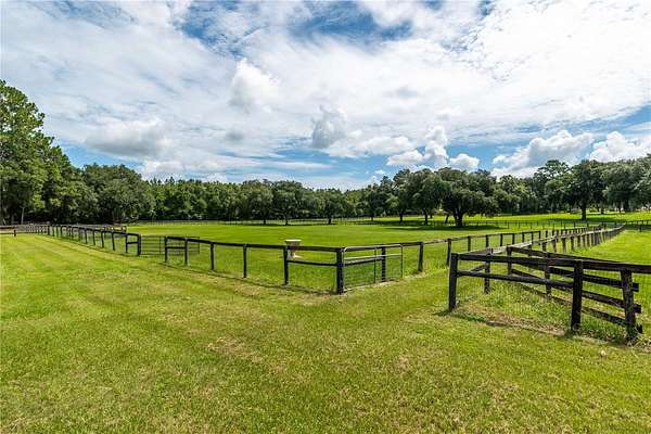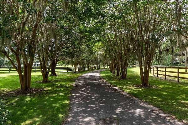 Located on a quiet country road in NW Marion County, River Mist Farm offers 42 acres of spacious pastures, glorious live oaks, and spectacular gardens and privacy. As a private horse facility the farm has been the birthplace of multiple stakes winners and champions and offers stunning landscape for whatever equestrian discipline you pursue. A beautiful canopy of crepe myrtles shade the driveway as it leads towards the 3-bedroom, 3-.5 bath multi-story main home built in 2005 featuring a unique layout with bamboo wood flooring and lots of natural light. There is no shortage of remarkable spaces in the home- The kitchen is fully equipped with stainless appliances including a Thermidor gas range and Sub Zero fridge, a large center island with granite countertops, lots of storage space, and an additional pantry. Adjacent to the kitchen is a lovely built-in wet bar complete with beverage fridge and direct access to the back patio. The main living area is a huge space that provides extensive built-in shelving and a wood-burning fireplace with tasteful brick facade. All bedrooms are inviting, though the primary suite is an especially notable space that showcases cathedral wood-beamed ceilings, a large layout, private access to the pool area, two large walk-in closets with comprehensive glass-front shelving units, and a private en-suite with a huge walk-in shower and dual vanities. Interesting spaces continue throughout the home, including the spacious in-house mud/laundry room with plenty of cabinet storage, a family room, multiple flex spaces including an office/den area that is home to a wine cellar and safe room, and a light and bright multi-use area that currently serves as an aviary. To the back of the home is the stunning pool area that provides the perfect place for entertaining and unwinding. A sparkling in-ground pool is adorned with a decorative rose motif, surrounded by a huge pool deck and several covered areas including a gazebo, summer kitchen space, a koi pond, a bocce court, an original antique cracker dog house, and several quiet reflecting areas within the garden. The care and dedication to the property are evident from the extensive established gardens, which bloom with perennials, agapanthus, hydrangea trees, and even angel trumpets. This property is perfect for those with a green thumb and even includes a greenhouse/garden shed with lots of natural light and plenty of space for growing potted plants all year long. A large generator, high-impact windows throughout, and a tornado closet offer additional peace of mind. Brand new roof! For equestrians a lovely 8-stall block barn features oversized stalls, barn office, bathroom, and a large loft that could be finished into a barn apartment if desired. A secondary barn is also in place, offering an additional 4-stalls, 12 paddocks, feeder pens, and a large round-pen are also established, and the farm's great land is scattered with gorgeous granddaddy oaks for gentle shade with lots of areas to ride and train. All of this and more are located less than 10 minutes from HITS and 15 minutes from the World Equestrian Center and OBS making this a standout property for anyone looking to "Live the Ocala Dream!"