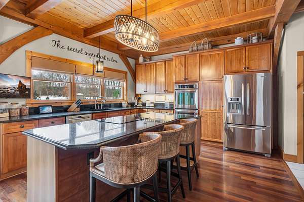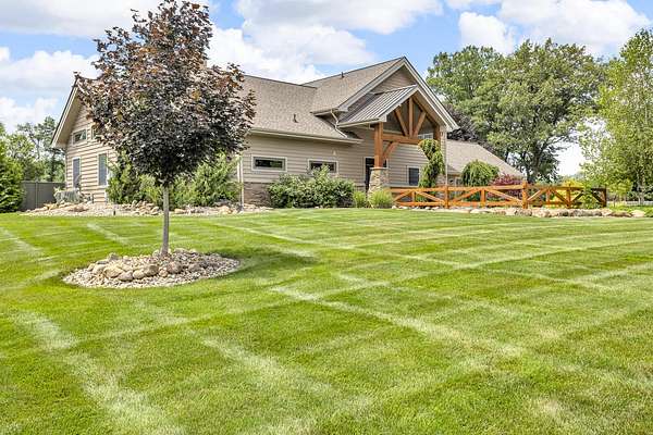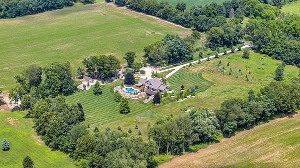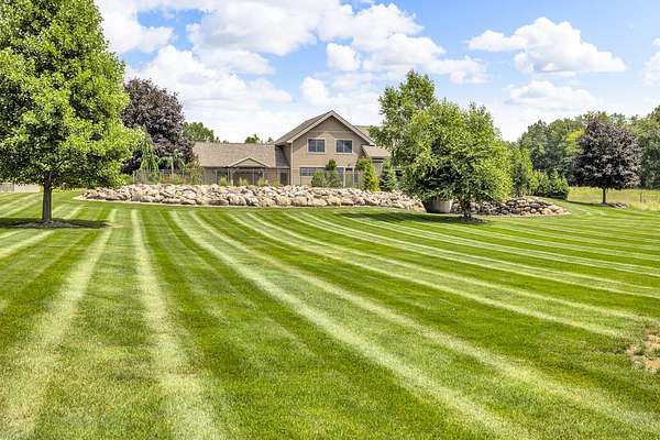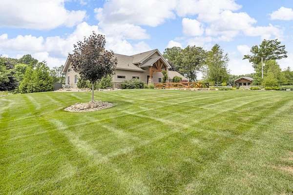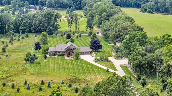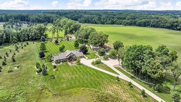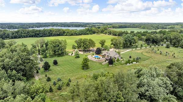 BOLD, LUXURIOUS & COMPLETELY CUSTOM SETTING THAT WILL STOP YOU IN YOUR TRACKS! A tree-lined concrete driveway leads you 500 feet off the road to a massive timber & stacked stone pillar covered grand entry to welcome you home! This impressive custom home spans over 4300 fin sq ft intricately crafted w/sophisticated architectural & design perfection sitting on 10.33 secluded acres offering peace, privacy & upscale country living. Surrounded by immaculate grounds of hardscape landscaping, tranquil pathways enhanced by atmospheric lighting & hundreds of evergreens to ensure the privacy remains. Inside, this estate features expansive living spaces with an open & inviting layout that seamlessly connects the living room, dining area & spacious kitchen outfitted in rich cabinetry & massive granite center island. This is an absolute entertainer's dream, from the kitchen & dining room, glass doors open revealing the generous backyard boasting a sprawling composite deck, stamped & colored concrete patios, gazebo for outdoor dining, heated pool & covered hot tub. Accents of timber frame beams, soaring ceilings, Brazilian Cherry hardwood floors, fireplace & dramatic floor to ceiling windows with natural light illuminating the open floor plan. Grand main floor primary ensuite with a walk-in closet, large private bathroom & direct access to the deck shaded by the retractable awning. Upstairs, two staircases lead to three additional bedrooms and an expansive full bath. One of the staircases opens up to a loft area overlooking the living room, ideal for a home office or bonus living space. The finished walkout lower level has even more room for recreation, a media area or guests with private home theater/rec room, half bath & gym creating endless possibilities for a future 2nd kitchen, wet bar & more. 2 Newer insulated, heated & (1) air conditioned outbuildings for hobbies plus a 24x24 barn with concrete floors & electric. One-of-a-kind heated two-car attached garage provides both character and extra space. In-ground sprinklers cover the entire lawn and the fenced in garden area. Some of the incredible updates include: 50 year warranty on house shingles (2017), whole house 48K Kohler auto generator (runs house, pool & outbuildings), boiler (2024), outdoor wood burner (2023), new pool liner (2024), pool heater (2023), CertainTeed insulated siding (2015), new covered hot tub (only used a handful of times), on demand hot water heater, RO system, paint, fixtures, landscaping & security system. Designed for grand-scale entertainment & intimate everyday living alike, this estate is a crown jewel. Premier location, less than a half mile from Farwell & Round Lakes, Jackson County's most coveted spring-fed lakes, several golf courses, The Grand River Fen Preserve, less than 20 miles to Jackson & Hillsdale plus a setting where neighboring property owners encompass 100+ acres each. This property has everything you needstyle, space, comfort and complete privacy. Don't miss your chance to own this extraordinary home with unmatched indoor and outdoor living.