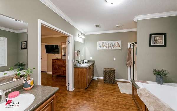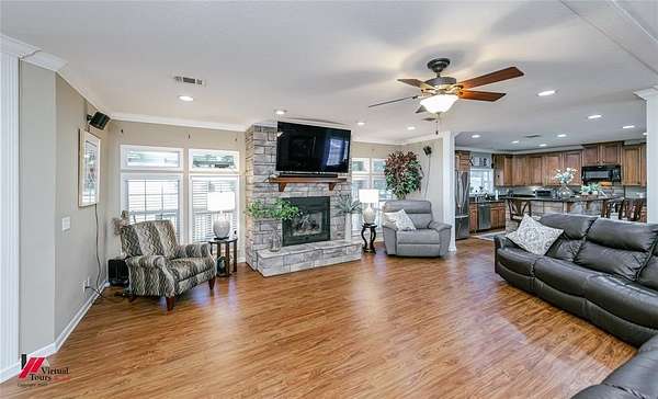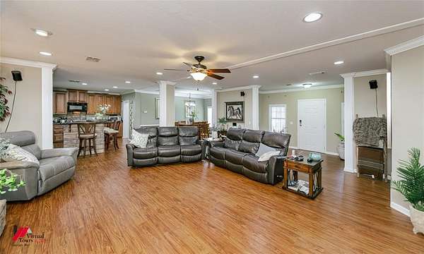 Fabulous 10 acres with 2700 sf 4 beds, 3 full baths, 2 car attached carport makes a peaceful country living, featuring a spacious 2010 triple-wide manufactured home with an inviting open floor plan. The large living area centers around a cozy fireplace, perfect for relaxing evenings. A chef's kitchen with generous counter space, custom cabinetry, and a large island makes entertaining easy, while natural light fills every corner of the home for a warm, welcoming feel.