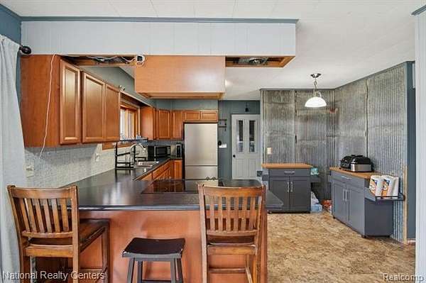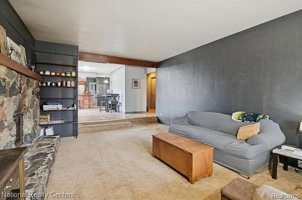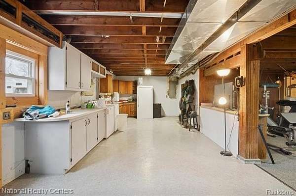 Step inside to a warm and functional main living area featuring large picture windows that fill the space with natural light. The home offers multiple living and dining spaces, including a cozy family room with a stone fireplace, perfect for gathering during cooler months. Adjacent dining areas overlook the surrounding landscape, creating an inviting setting for meals and entertaining. The kitchen features solid wood cabinetry, ample counter space, and room for an eat-in setup. Several additional rooms--including flexible spaces, offices, hobby rooms, or storage areas--give this home a highly adaptable layout for work, recreation, or multi-generational living. Bedrooms are comfortably sized with natural light, while the home includes multiple bathrooms with both updated and classic finishes. A major highlight is the expansive basement, offering large workshop zones, storage, gym space, and unfinished areas with excellent potential for further customization. Whether you need workspace, recreation room possibilities, or long-term storage, this lower level delivers versatility. Outside, the property features a covered porch, walk-out sections, wide yard space, and plenty of opportunity for gardening, outdoor projects, or simply enjoying the privacy and open setting. The exterior shows a combination of natural materials and rural charm.