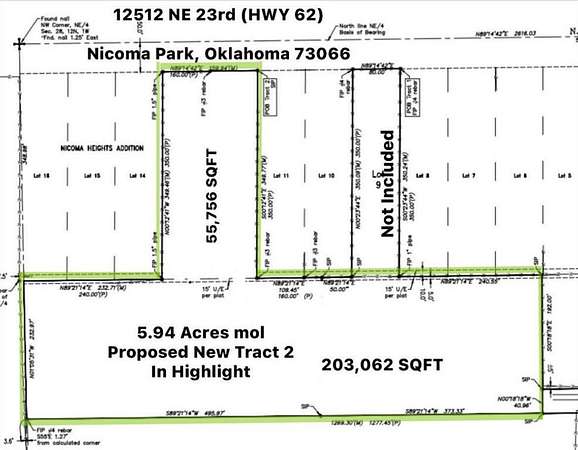 This 5.94 acres (mol) is a great zoning diversification opportunity off Highway 62 (NE 23rd ) in the heart of Eastern Oklahoma county and the highly desired Nicoma Park/Choctaw school district. With location, visibility and good traffic (15,000+ daily), this land is prime for development, and close to large employers like Tinker Air Force Base and Boeing. With 160' feet of frontage on NE 23rd (HWY 62) the options are plentiful and mixed zoning is possible. Currently Zoned as C-2, The property location is also within 2 miles of new housing developments that will add about 600+ new homes in the next few years, along with solid anchor stores like Walmart, Braum's, Starbucks, etc. The city of Nicoma Park has been favorable to a variety of development options that would benefit the community as it continues to grow! Retail, strip/mini mall, residential, fast food, storage, offices, etc. In the last couple of years Nicoma Park has seen several new businesses enter their city limits for affordability, flexibility and the ease of working with the city. Available utilities are OG&E, ONG, City Water, City Sewer, COX, AT&T. New residential happening less than 2 miles away: *Sierra Villas: 2601 N Westminster Rd Nicoma Park, OK 73066 *Westfall: 13051 NE 10th Choctaw, OK 73020 (This developer also owns 92 acres across from this neighborhood and dirt work has started) Tinker Air Force Base & Boeing: 12 minutes Bricktown & Paycom Center: 19 minutes Central Edmond or Moore: 30 minutes Will Rogers International Airport: 28 minutes Lastly I've been told that there's a wild boar that frequents the property, just be aware of that.