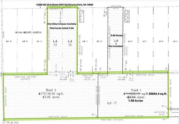 This 5.94 acres (mol) of land located in Nicoma Park on NE 23rd (HWY 62). Zoned C-2 the 160' frontage opens to the partially wooded area in the back. The City of Nicoma Park is very affordable and usually easy to permit and they more than welcome new businesses. A few examples of use would be storage facilities, single family, multifamily, office complex, restaurant, hotel, event center, etc. The growth in this area has been growing steadily with several new businesses, land transactions, plus two new housing additions with hundreds of new homes going in. I-35 to the west and Kickapoo Turnpike east make this a prime location, shopping, healthcare, groceries, and all other amenities. The available utilities are OG&E, ONG, City Water, City Sewer, AT&T, and Cox Cable.