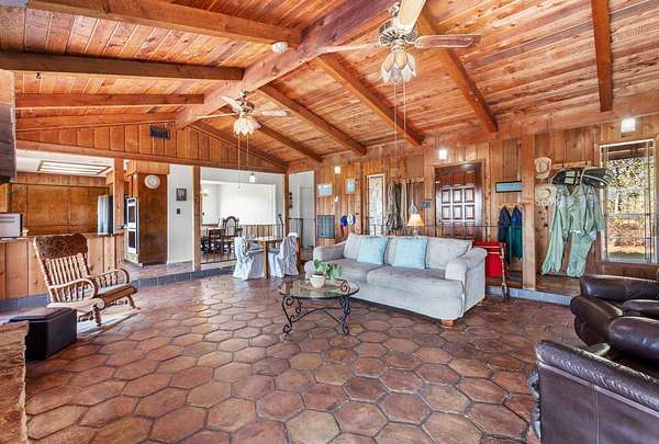 - Beamed Ceilings, Built-In Features, Ceiling Fan(s), Primary Bedroom On Main, Walk-In Closet(s), Wet Bar