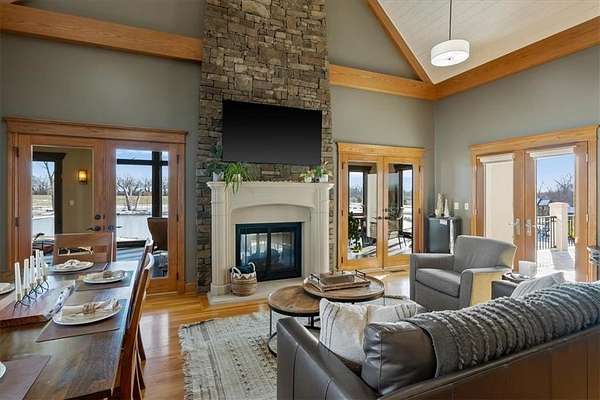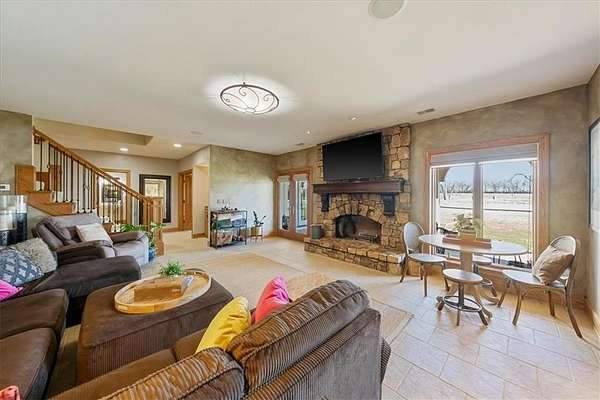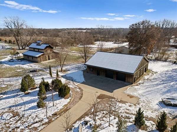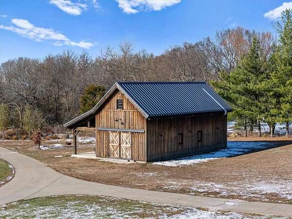 There are properties you tour... and then there are properties you feel. At 12517 S. Harris, life slows down, settles in, and expands in all the right ways. This isn't just another Kansas City estate. It's your sanctuary-your retreat-your adventure. Set on 20 peaceful acres just 25 minutes from Kansas City, this Lee's Summit oasis delivers Pacific Northwest serenity from the moment you enter the winding drive. Five stocked ponds, private walking and golf-cart paths, wide-open pastures, and soaring bald eagles set the tone. Beyond the 8,100 sq. ft. primary residence, the estate offers three beautifully crafted outbuildings featuring distressed ponderosa pine, standing-seam metal roofs, and clean architectural lines. The brand-new 5-stall barn is ready for livestock, while the expansive workshop fits 8 cars, a boat, an RV, a full workshop, an indoor pickleball court, plus a 1-bed/1-bath guest suite. A finished lofted garden barn adds flexible space for events, an art studio, a gym, or a dream playhouse. Inside the main home, color-rich interiors, warm woods, floor-to-ceiling windows, updated lighting, natural stone fireplaces, and a chef's kitchen with 10 gas burners make every day feel elevated. The main-floor primary suite offers sweeping views and a spa-like bath with steam sauna and soaking tub. Oversized secondary bedrooms-two with private living spaces-and a hobby room "made of Etsy dreams" ensure comfort for all. Multiple media areas and a full bar bring year-round fun. And while this estate feels super private, it's just a 10-minute drive to popular downtown Lee's Summit and close to top-rated schools, shopping, and everyday amenities-giving you the best of all worlds. With its shimmering ponds, crisp air, wooded paths, and endless opportunities for connection, recreation, and rest, this natural oasis is a one-of-a-kind property to explore and enjoy for years to come.
