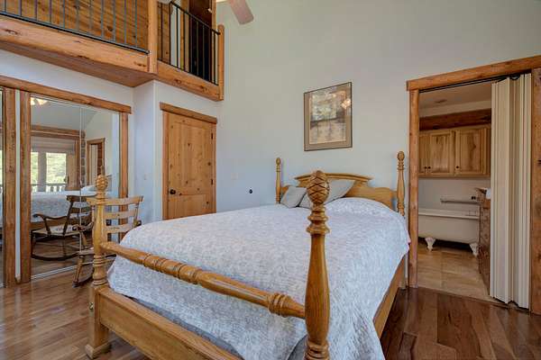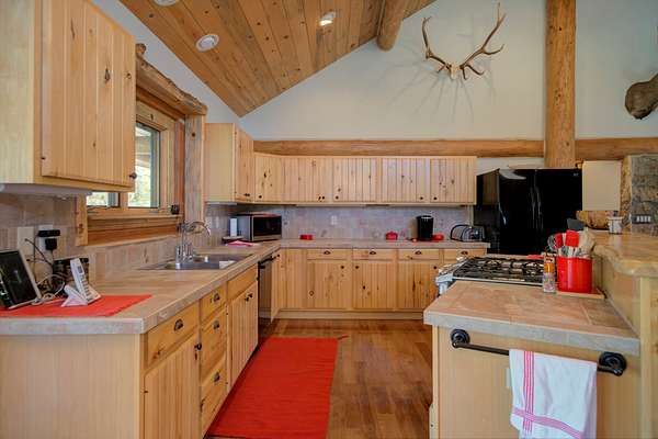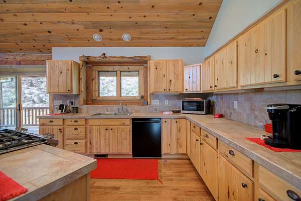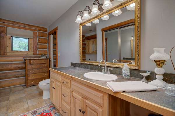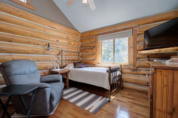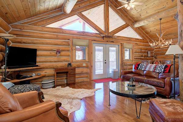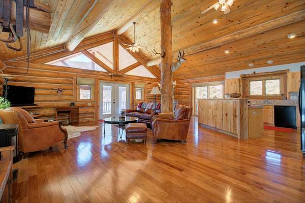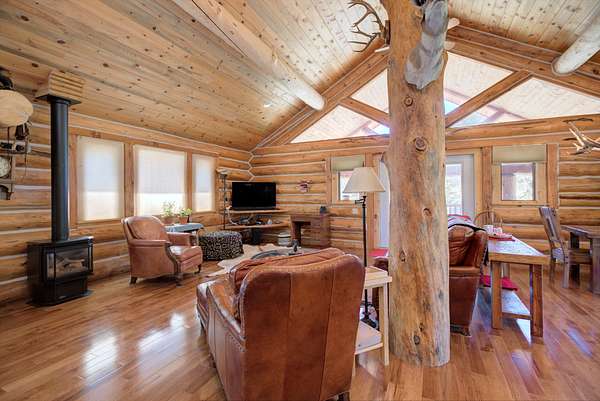 The main residence is a 1,440 square foot custom log home, built in 2001 with classic mountain character and thoughtful craftsmanship. Designed for full-time or seasonal use, the home features vaulted ceilings, a covered wraparound deck, and an open floor plan, a propane stove and panoramic mountain views.