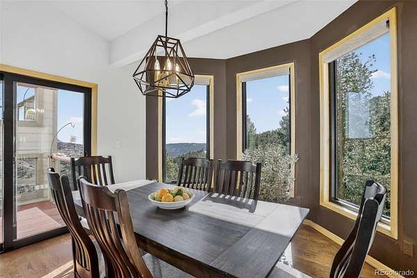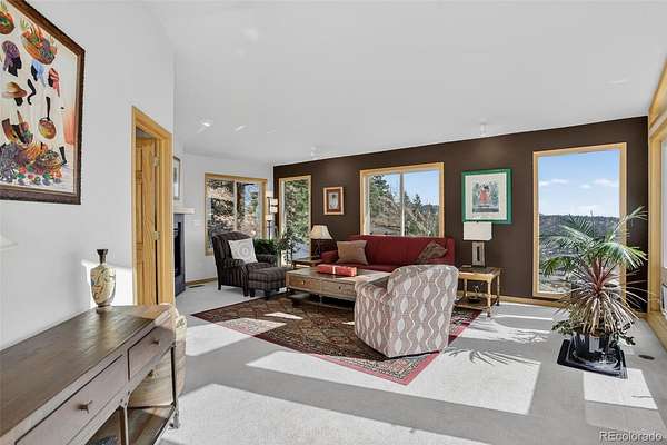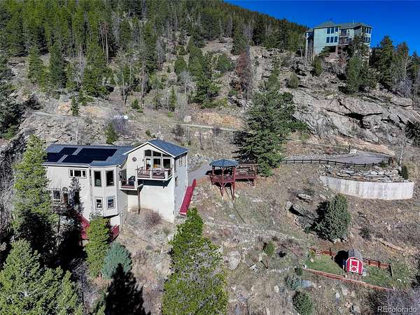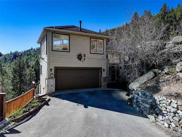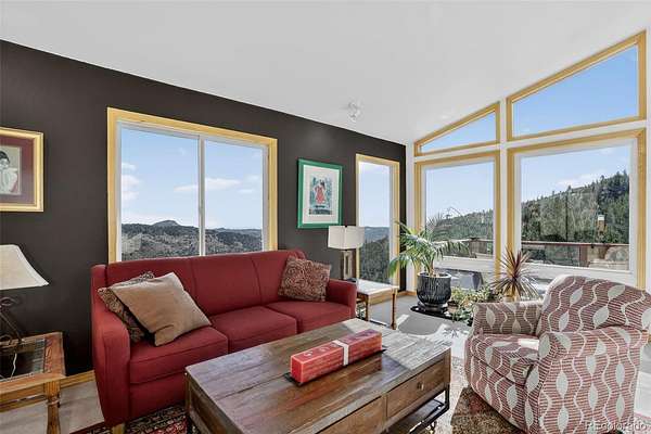 Perched on the mountainside encased by dramatic rock outcroppings, aspen and pine, this 2,720 SF Colorado home captures sweeping city, sunrise, and mountain views from nearly every window. Thoughtfully designed with high ceilings and expansive picture windows, the home is filled with natural light and showcases the beauty of surrounding forest and rock outcroppings throughout. The open kitchen encompasses a large island, pantry, kitchen sink with picture windows, built-in shelving and cabinetry, separate built-in desk area, and opens to dining and living rooms with access to two decks, redwood pergola and gazebo with swing. The primary suite offers a complete getaway featuring a 5-piece bathroom complete with remodeled shower, jet tub surrounded by picture windows for a soothing soak, dual pedestal sinks, and separate water closet; a cozy gas-log fireplace for chilly nights; vaulted ceiling; wood floor; views of impressive rock outcroppings nearby creating a spa-like ambiance with the essence of nature all around; and best of all...private deck access to your own Heavenly Sauna 2-person barrel sauna. The walk-out lower level completes the living areas with 2 more bedrooms, remodeled bathroom with marble counter vanity and steam shower, and inviting 2nd living room with tasteful black built-ins around a cozy pellet stove and 4th private deck access. An exterior accessed bonus room is used as a wine cellar and storage. Additional highlights include 3 fireplaces, active solar, new Pella triple pane windows and slider, leaf filter gutter protection system, and a finished walk-out basement with high ceilings. Constructed with I-Beam steel and stone reinforcement, this home sits quietly on a cul-de-sac overlooking the city at a tranquil distance. Bonuses: annual energy savings, insulated 2-car garage, spa features, natural light, incredible views, quick access to I-70 to ski resorts, DIA, Evergreen and Denver amenities. Don’t miss the walk-through video (virtual tour)!