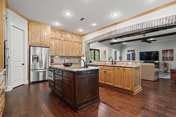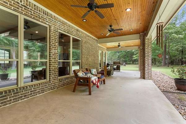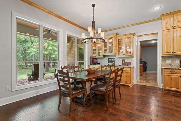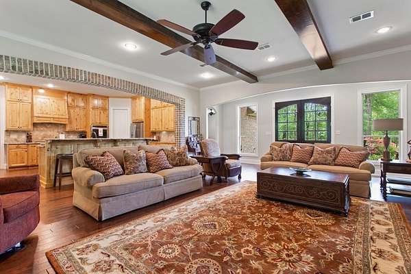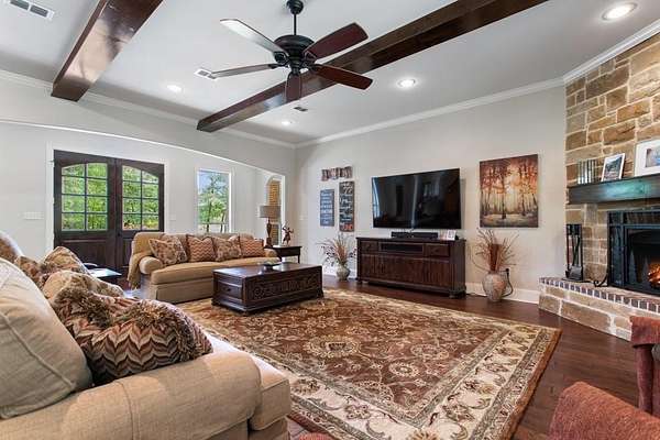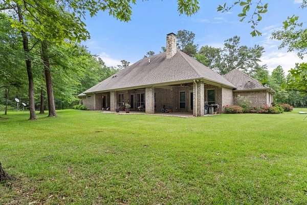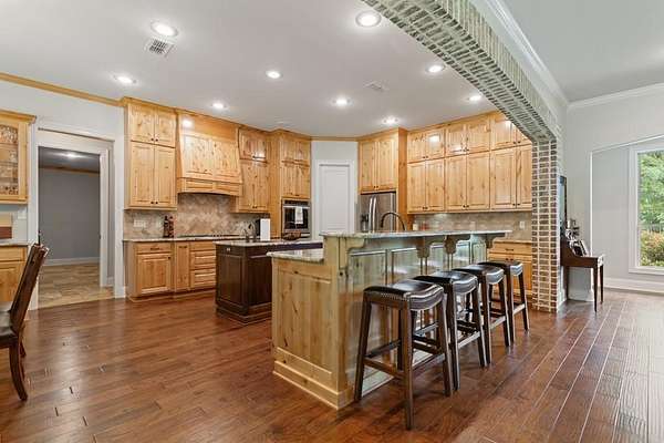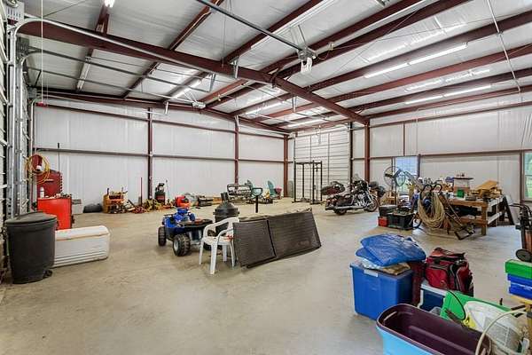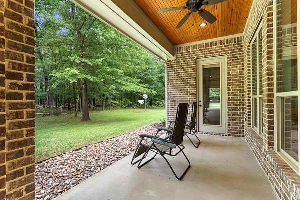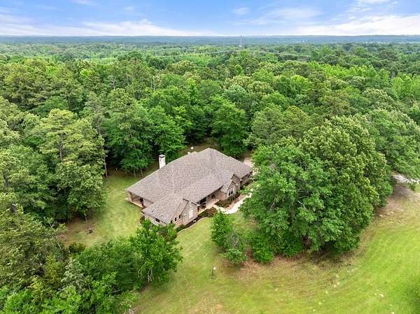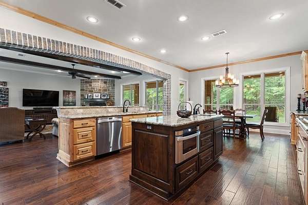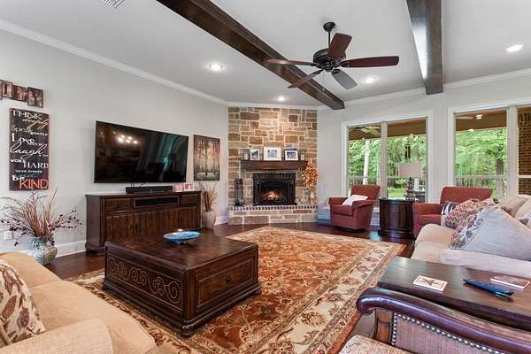Over 13 acres of privacy, trees, and space to spread out. This custom-built home is designed with functionality and quality throughout. A gated entrance and long driveway lead to a peaceful setting surrounded by nature. Inside, the spacious living area offers large windows with wooded views, wood floors, ceiling beams, and a stone gas-log fireplace.