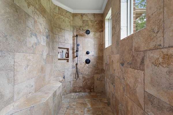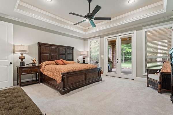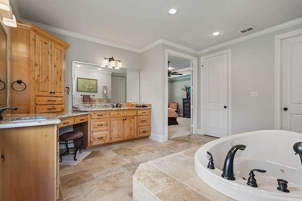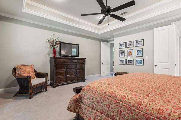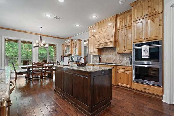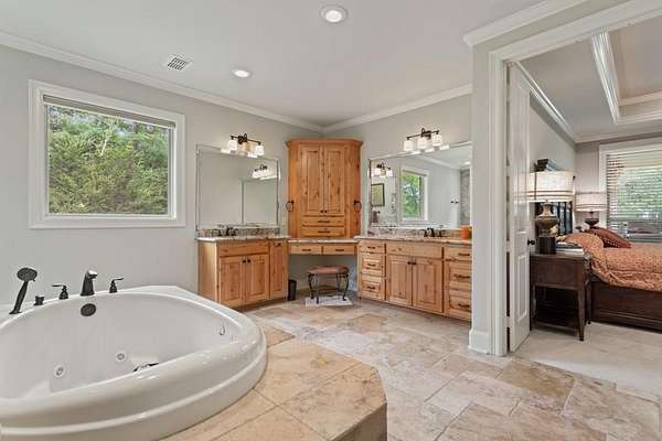 The open kitchen features two islands, two sinks, two disposals, a gas cooktop, double ovens, microwave drawer, granite counters, and floor-to-ceiling cabinets. A walk-in pantry provides ample storage. The primary suite includes a tray ceiling, large walk-in shower with multiple heads, jetted tub, dual vanities, and generous closet space.