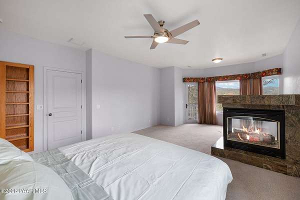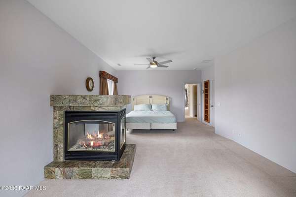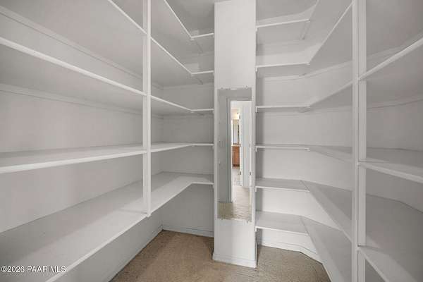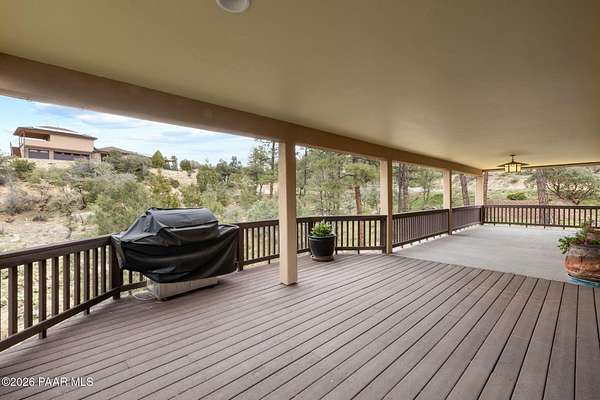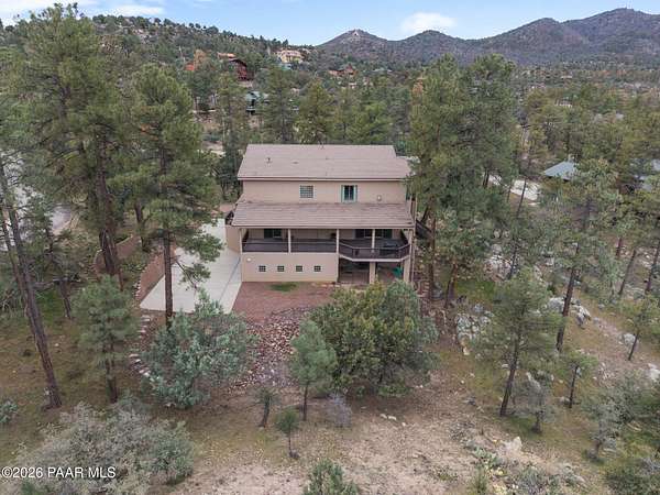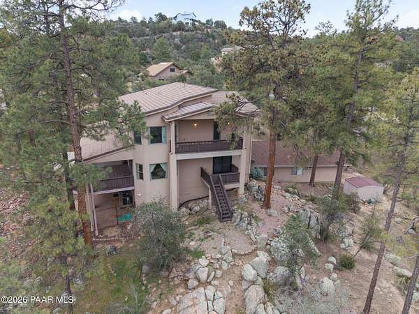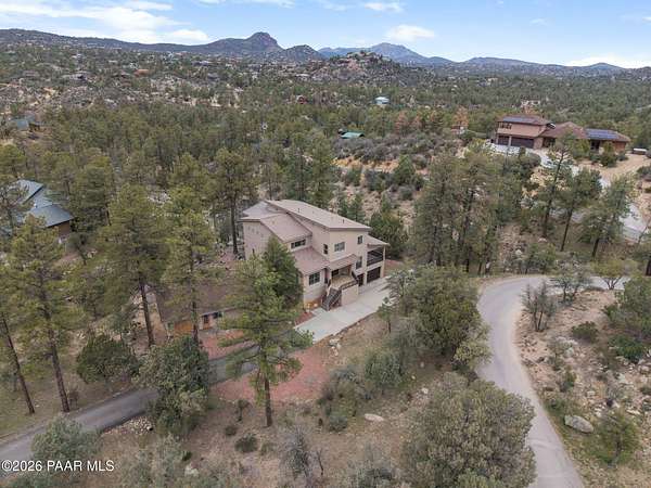 Hidden among towering pines on 1.8 acres of serene landscape, this extraordinary custom residence captures the essence of refined mountain living where privacy, elegance, and comfort converge just moments from the heart of Prescott. From the moment you enter, expansive windows frame endless treetop views. The formal dining room offers a dramatic setting for gatherings, while the living room invites relaxation with surround sound and a striking fireplace. The kitchen was designed for connection opening seamlessly to an expansive deck made for sunset dinners and effortless entertaining. Not to mention the dumbwaiter from the garage to a cabinet in the kitchen for easy transport of the groceries. Along with a built-in natural gas grill ensures gatherings are never interrupted. Upstairs, a breathtaking library loft overlooks the living space below, a quiet sanctuary for reading, reflection, or inspiration. The primary suite is a retreat unto itself, complete with a cozy fireplace, private deck nestled in the pines, spa-inspired bath with jetted soaking tub, dual walk-in closets, convenient upstairs laundry. Additional upper-level spaces offer flexibility for guests, creative pursuits, or executive office needs. Separate guest quarters provide full independence with a private garage, kitchen, and bath, perfect for multi-generational living or extended stays. This is more than a home, it is a private mountain sanctuary designed for those who value craftsmanship, tranquility, and elevated living.