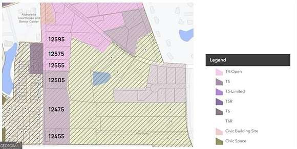 Est $13,906/moDowntown Crabapple across from existing residential/commercial and close to the proposed Mayfield District. Zoned T4 Open: mixed use, residential, commercial T4 by definition: Mixed uses including Residential, Office, and Commercial. Residential may have a wide range of building types: single, sideyard, and rowhouses. Setbacks and landscaping are variable. Streets with curbs and sidewalks define medium-sized blocks.