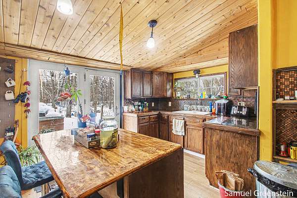 Welcome to 1258 56th Street in Fennville! Experience this truly unique home on 4.69 private acres. A charming 800 sqft, 1-bedroom, 1-bath residence offers the perfect blend of rustic character, thoughtful craftsmanship, and modern mechanical updates, all in a peaceful country setting. The home underwent an extensive renovation between 2017-2019, including a new roof, updated electrical, HVAC, plumbing, insulation, drywall, barn doors, and flooring throughout. The interior showcases exceptional attention to detail with reclaimed barnwood accents, a stunning cedar tongue-and-groove plank ceiling, and a warm, inviting layout filled with natural light. The kitchen is a standout feature, complete with custom cabinetry, cement countertops with walnut inlay, updated kitchen appliances, and tasteful finishes that blend durability with style. Updated paint, laminate flooring, and carpeting complete the comfortable living spaces. The property is serviced by a 150-foot deep well producing crystal clear water, adding to the quality and self-sufficiency of the home. With nearly five acres of land, there is ample room to enjoy nature, garden, explore, or simply take in the privacy and tranquility that this setting provides. Ideal as a full-time residence, weekend retreat, or investment opportunity, this property offers a rare combination of acreage, craftsmanship, and modern upgrades just minutes from Fennville.