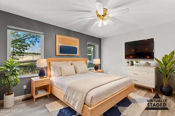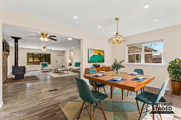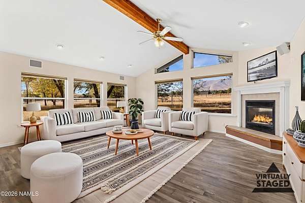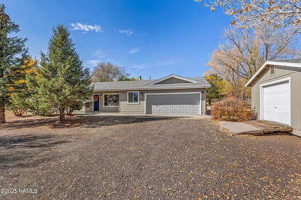 Welcome to this spacious 4-bedroom, 2-bath home set on 2.5 acres of serene Northern Arizona beauty. Panoramic views of Mount Elden and the San Francisco Peaks create a stunning backdrop from sunrise to sunset. Start your mornings sipping coffee while taking in the peaceful mountain scenery, and end your evenings surrounded by quiet, natural surroundings. Inside, the generous layout offers plenty of room to gather, relax, or spread out. A two-car garage, along with two sheds provides ample space for tools, toys, and hobbies. Despite the privacy and wide-open feel, you're still just minutes from everyday necessities, giving you the best of both worlds. With its acreage, views, and tranquil setting, this property offers a rare opportunity to create your own mountain retreat in a truly desirable Flagstaff location.