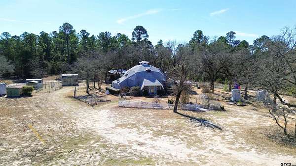 Escape to the peaceful beauty of the pinewoods and dogwoods with this truly unique geodesic dome home nestled atop a wooded hill on nearly 8 acres of scenic countryside. Surrounded by natural charm, the property showcases blooming dogwoods and vibrant azaleas that add seasonal color and classic East Texas character. Designed to embrace natural light, the interior feels bright and welcoming, creating an inviting retreat immersed in nature. The updated kitchen offers modern convenience and style, while spacious living areas provide comfort and flexibility. Enjoy outdoor living at its best with a covered back deck and patio -- perfect for relaxing, entertaining, or simply taking in the serene views and abundant wildlife. This property is well-equipped for both practicality and hobbies, featuring multiple storage buildings ideal for tools, projects, or workspace, along with a chicken coop for those seeking a touch of homestead living. A Generac generator and Starlink connectivity provide reliability and modern connectivity while maintaining the peaceful, tucked-away setting. Whether you're looking for a private getaway, hobby property, or full-time residence surrounded by nature, this one-of-a-kind property offers space, functionality, and tranquil surroundings ready to be enjoyed.