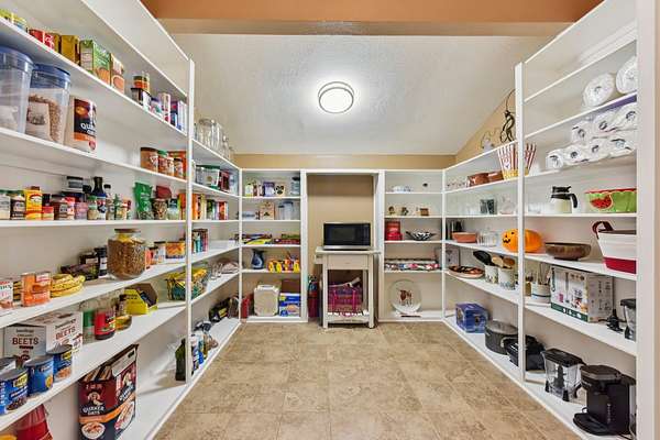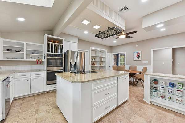 - Built-In Features, Ceiling Fan(s), Ceiling-High, Crown Molding, Double Vanity, Eat-In Kitchen, Entrance Foyer, Granite Counters, Kitchen Island, Multiple Dining Areas, Multiple Living Areas, No Interior Steps, Open Floorplan, Pantry, Primary Bedroom On Main, Recessed Lighting, Walk-In Closet(s)